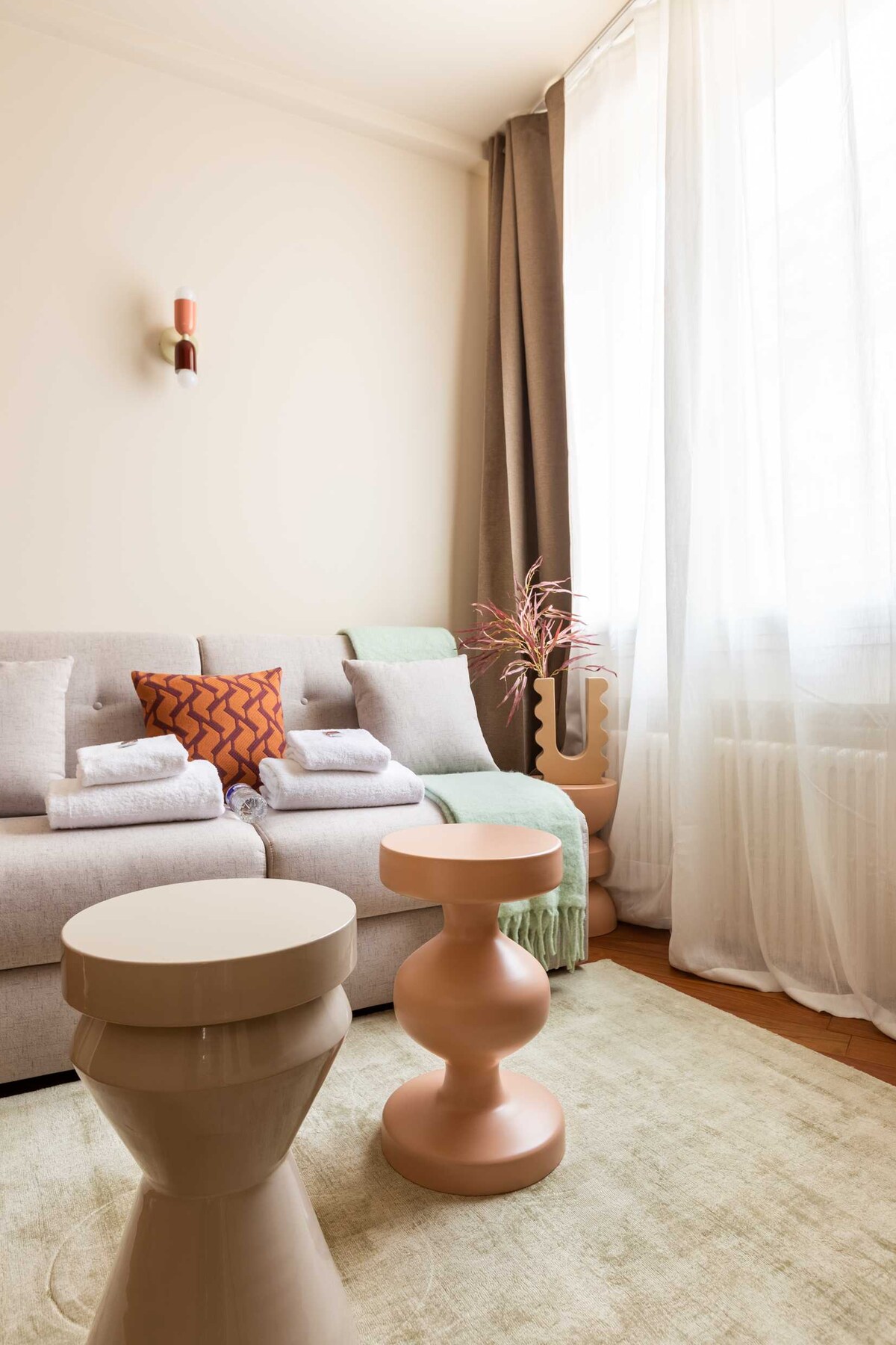 Con vistas a nuestro impresionante patio interior y a la encantadora iglesia vecina, tu pied-à-terre ofrece vistas abiertas, luz natural increíble y tranquilidad absoluta, en el corazón de París. Cada departamento incluye una sala de estar con sofá cama, un comedor con una mesa redonda, un hermoso dormitorio con una cama de lujo de calidad hotelera, una cocina abierta totalmente equipada con lavavajillas y lavadora-secadora, un baño con ducha y un inodoro separado.