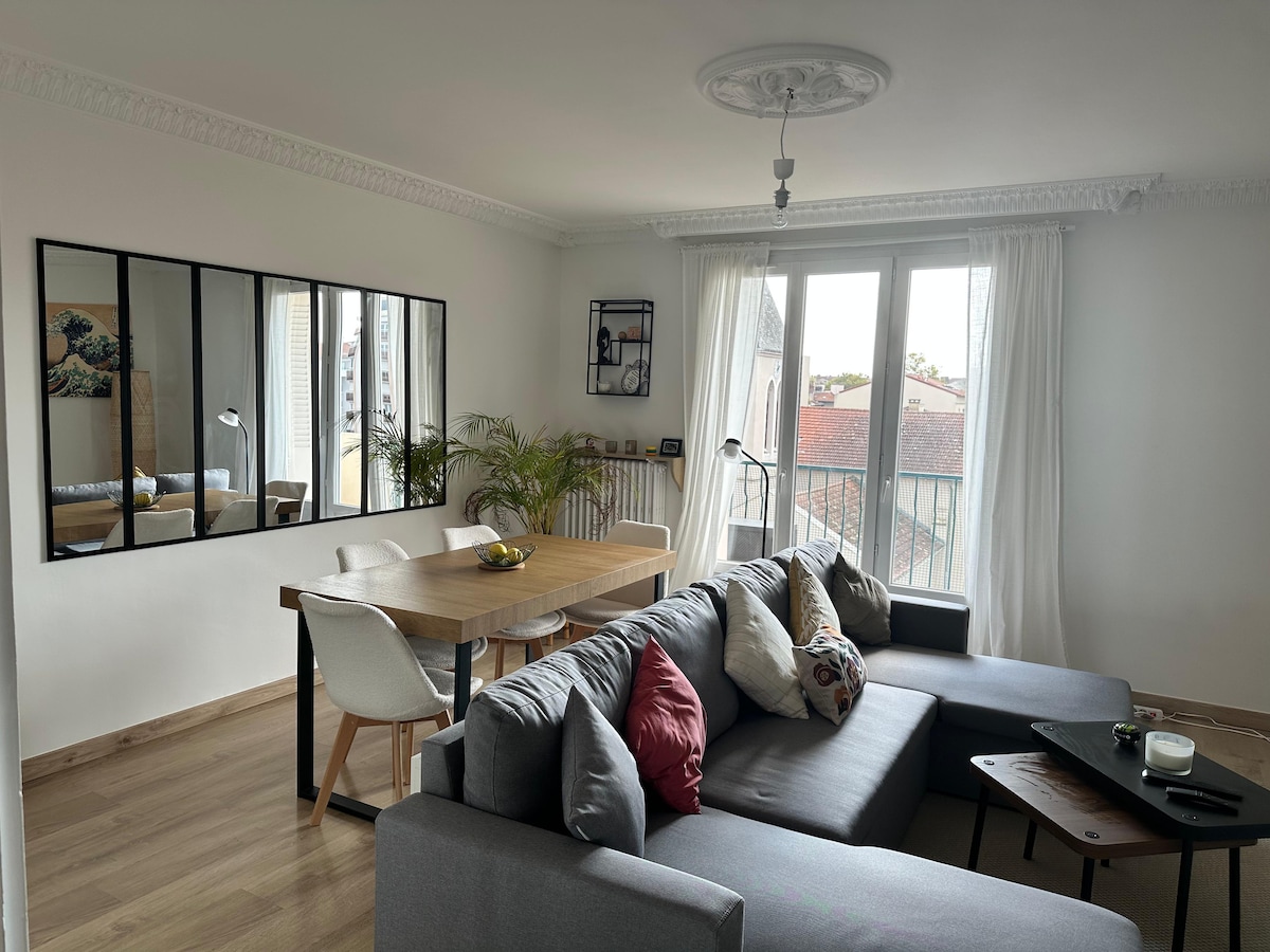 Amueblado 🏡 con todas las comodidades 😎 en Bron centro 📍 a 50 metros del tranvía🚃, ¡llegue a Lyon, el metro🚇, Eurexpo 🗺️ o las facultades 🎓 en pocos minutos! ¡Cama XXL🛌! Cambie a modo de confort ✨ y encanto con un pequeño jacuzzi de 🛀 2 plazas (PEQUEÑO BALÓN = se necesitan 2h45 después del uso ⏳) LED en el techo✨, apartamento completamente renovado pantalla 🛠️ grande 📺 con aplicaciones. Zona de comedor 🍽️ + mesa de comedor🪑. Descanse bien y disfrute del jacuzzi conectado📱. Nos vemos 👋 gracias 🙏