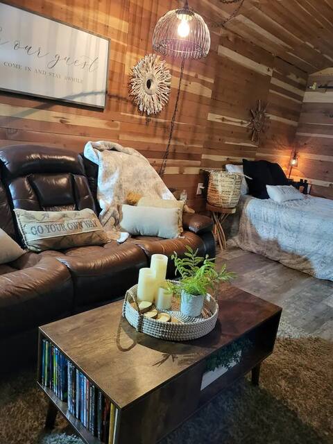 Cumple tus sueños de paz y tranquilidad acogedora, romántica y tranquila en nuestra pequeña casa en la colina. Disfruta del café y del amanecer en nuestro gran porche delantero con vistas al valle del río Illinois. En el porche trasero cubierto de árboles, echa algunos shish kebabs en la parrilla. Desempaca tus maletas y relájate en la lujosa cama tamaño queen del dormitorio. Disfruta de la comodidad de un hogar en la pintoresca cocina. ¡Encontrarás todo lo que necesitas para ser chef por un día! Y luego recuéstate y disfruta de un buen programa en el televisor inteligente.