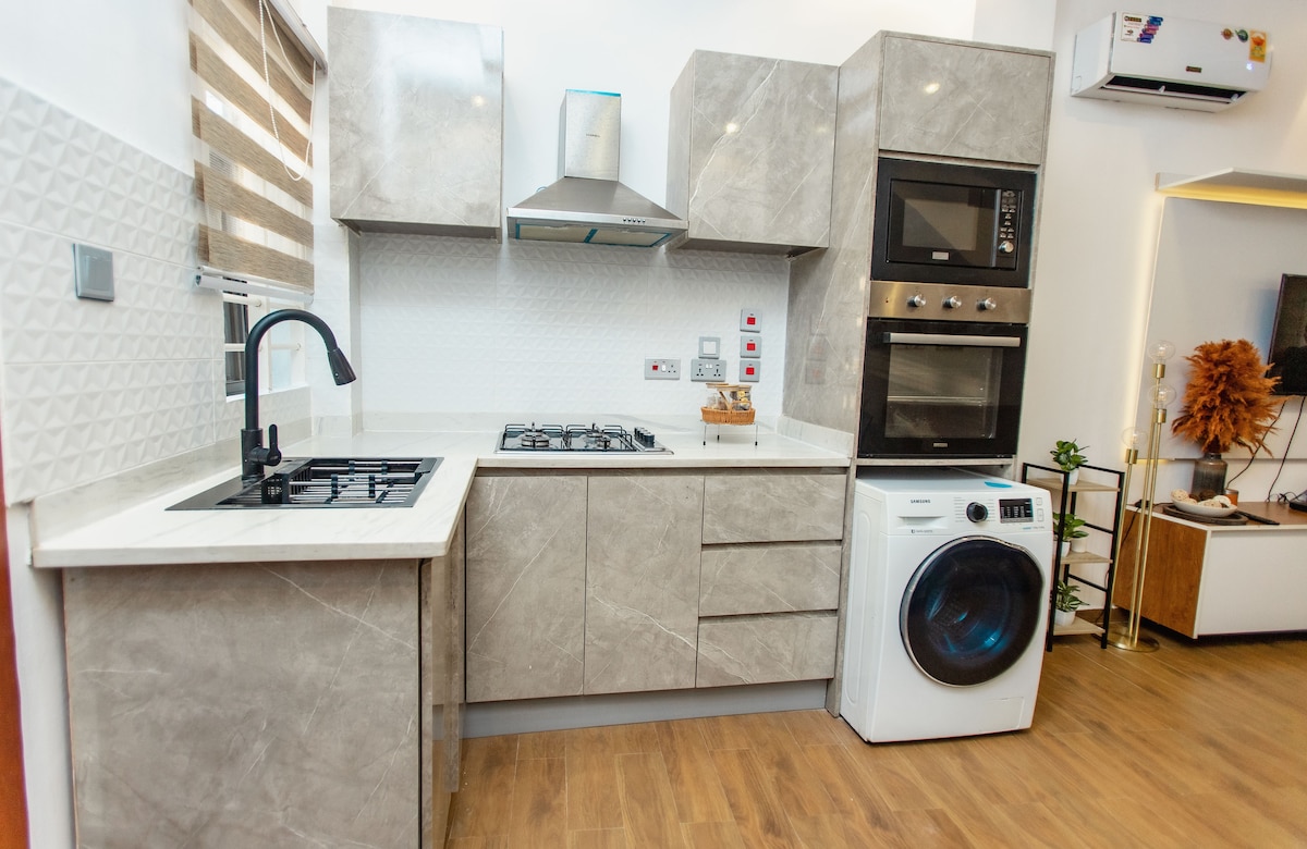 Comodidad moderna en un departamento elegante y bellamente iluminado con un acabado contemporáneo limpio y un cálido resplandor nocturno que se siente instantáneamente exclusivo y acogedor. Situado en un barrio tranquilo a 19 minutos del aeropuerto, a 17 minutos del centro comercial Accra, a 10 minutos del centro comercial Atlantic y a unos 30 minutos de las montañas Aburi, ofrece fácil acceso a tiendas, centros de negocios y centros de ocio. Nunca estás lejos de todo lo que necesitas, pero aún así lo suficientemente escondido como para relajarte y descansar. Un refugio elegante al que te encantará volver a casa.