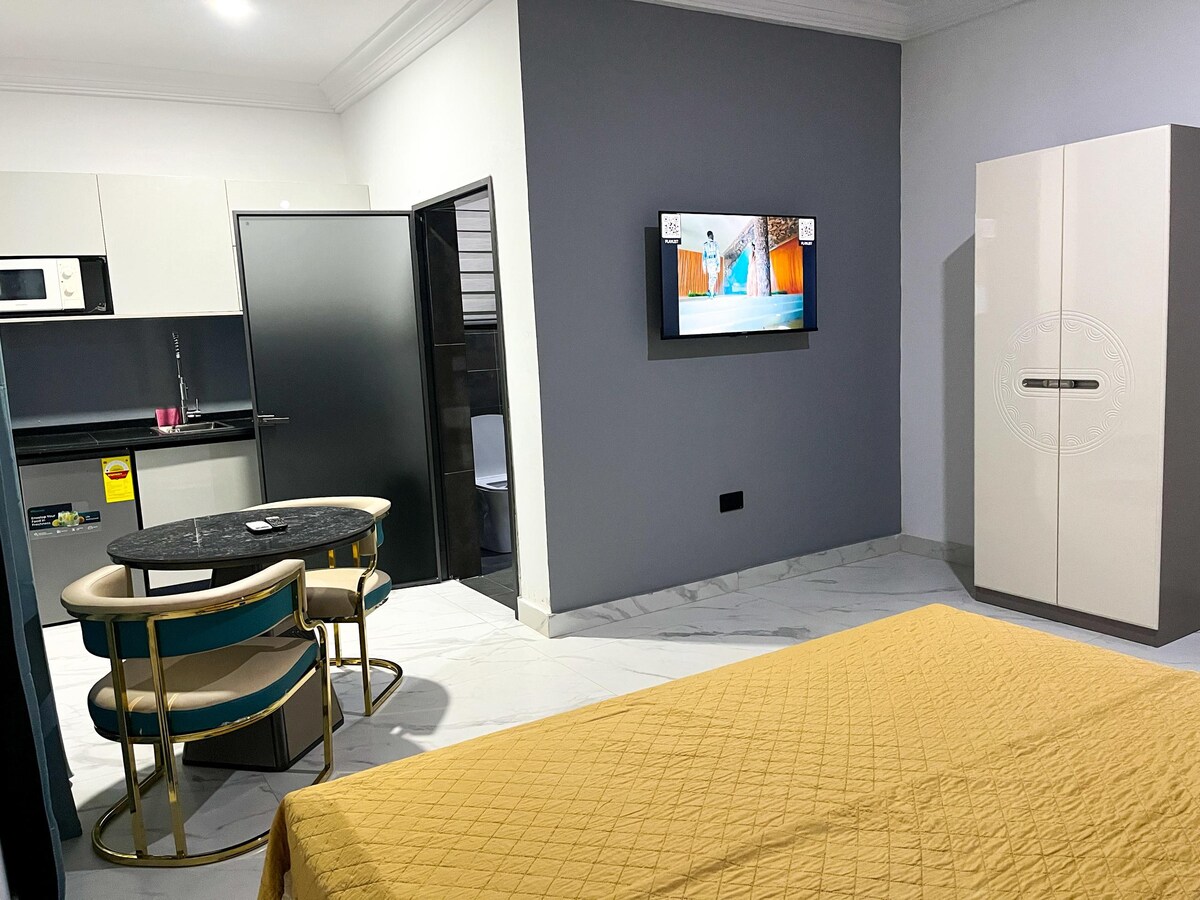 Disfruta del lujo moderno y la comodidad tranquila en Borteyman Luxe Escape. Ubicado en los tranquilos y seguros apartamentos Borteyman SSNIT, este elegante apartamento de 1 dormitorio ofrece 1,5 baños, una cocina totalmente equipada, lavadora, dos aires acondicionados, un armario personalizado y un escritorio de trabajo dedicado. A solo 20 minutos en auto del Aeropuerto Internacional de Kotoka, es perfecto para viajeros de negocios, trabajadores remotos o una escapada relajante. Disfruta de un check-in sin problemas, wifi rápido y fácil acceso a los mejores lugares de Accra.