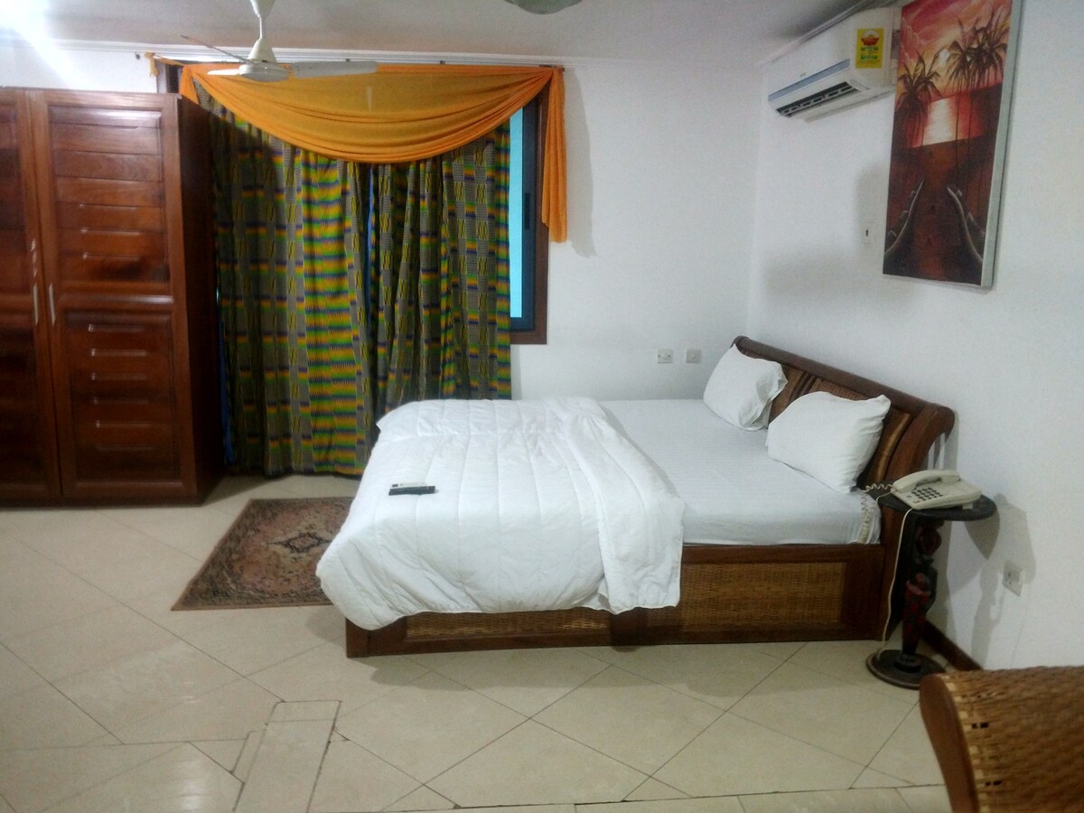 Este bed and breakfast tiene una ubicación céntrica en American House en East Legon. Tienes todos los servicios internos. También tienes todo lo que Accra tiene para ofrecer a pocos minutos a pie o en un rápido viaje en uber. Se puede acceder fácilmente a un viaje a las afueras montañosas como Aburi o sumergirte en el centro de la ciudad de Osu, Labone y Cantonments para disfrutar de vida nocturna, excursiones y compras. Esta casa ofrece un desayuno continental de cortesía todos los días junto con el uso mejorado del personal de apoyo. Esta lista es para una habitación.