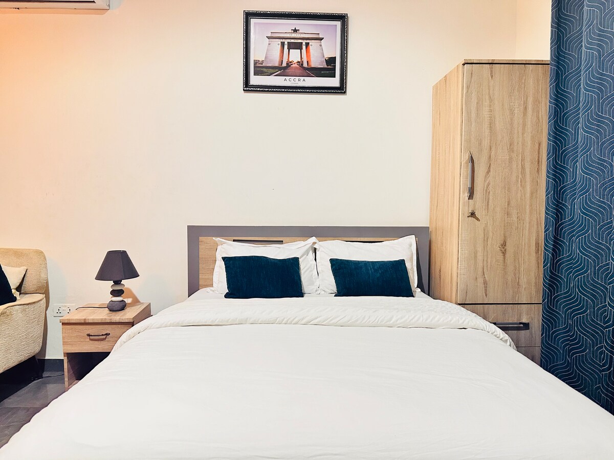 Este es un apartamento de condominio totalmente amueblado con un dormitorio y una sala de estar. El lugar está situado en el centro, a unos 25 minutos del aeropuerto internacional de Kototoka y a 10-15 minutos del centro comercial Accra. El lugar está amueblado con un cómodo colchón tamaño king, dos aires acondicionados, Internet WIFI de alta velocidad, una cocina totalmente funcional, un espacio de trabajo dedicado y un baño. Estadio Borteyman (7 minutos a pie). Centro comercial China (8,1 km) Tema Hospital (9 km) Restaurantes/tiendas a poca distancia