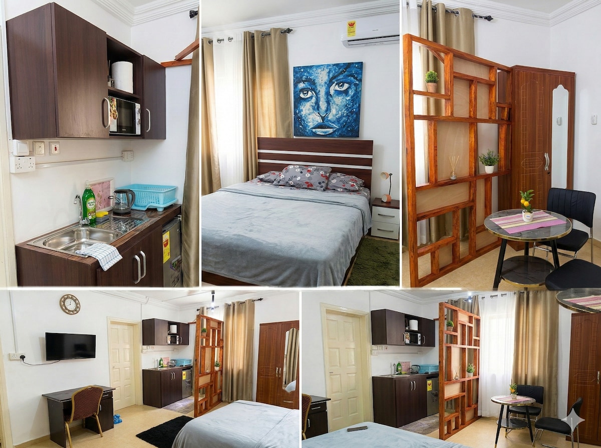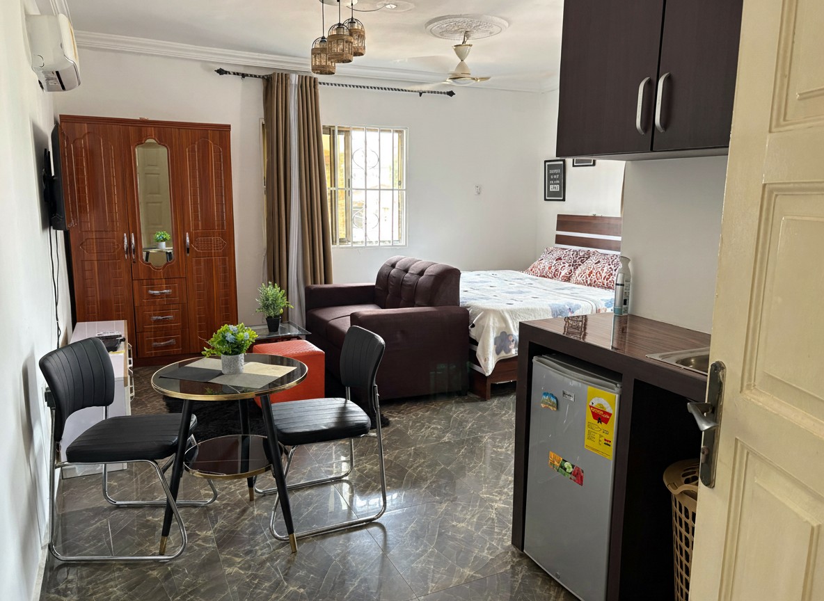 The solar-powered apartment is situated in a serene gated estate, fully air-conditioned and consisting of 2 bedrooms, a living room with a flat-screen TV with satellite channels, a fully equipped kitchen with a fridge and microwave and 2 bathrooms with a shower. The facility has 24/7 security and 5G internet to stay connected with your friends and partners across the globe. The apartment is about a 15-minute drive from the Kotoka International Airport, Accra.