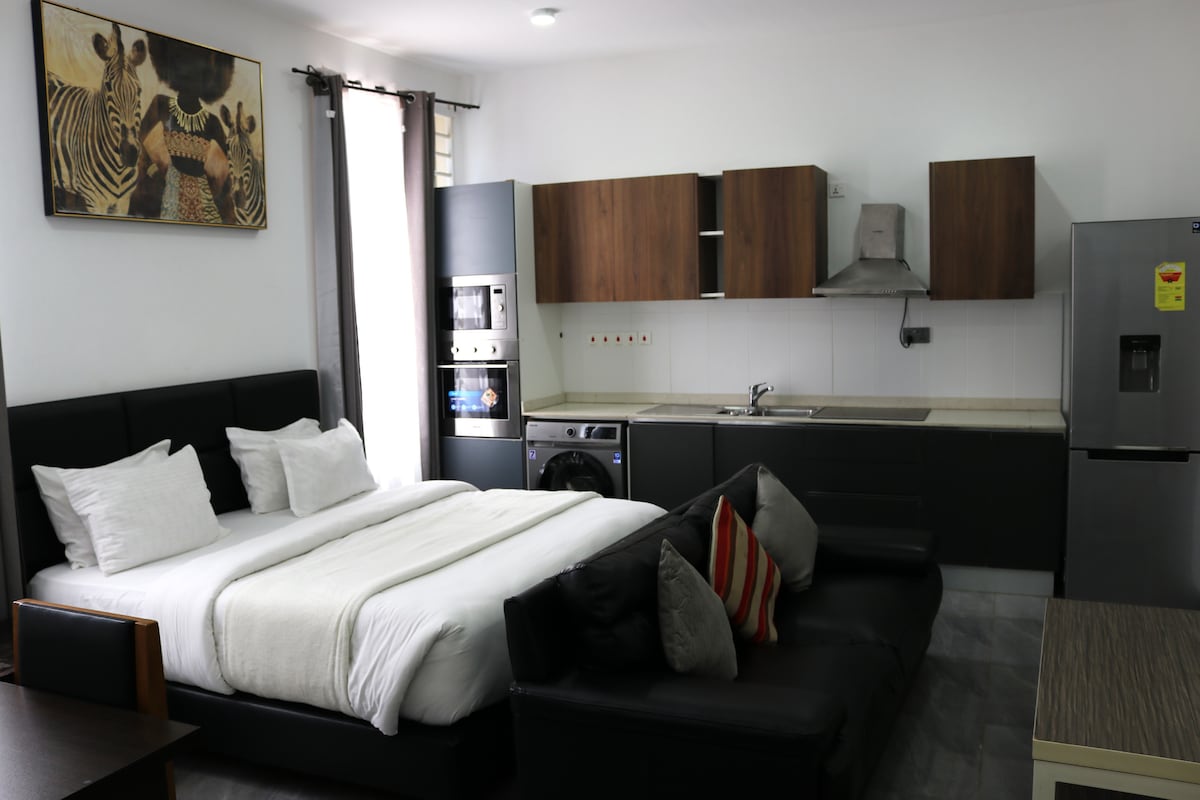 This beautiful large apartment is offered within a serene hotel setting. This means guests gain access to a well-equipped gym, a bar and a restaurant. The apartment is in East Legon, Accra, allowing for easy access to popular shops and restaurants just a few minutes away. The studio is set up for self catering, however all bookings come with complementary breakfast for two. There is a reception desk that operates 24/7 and porter service throughout the day.