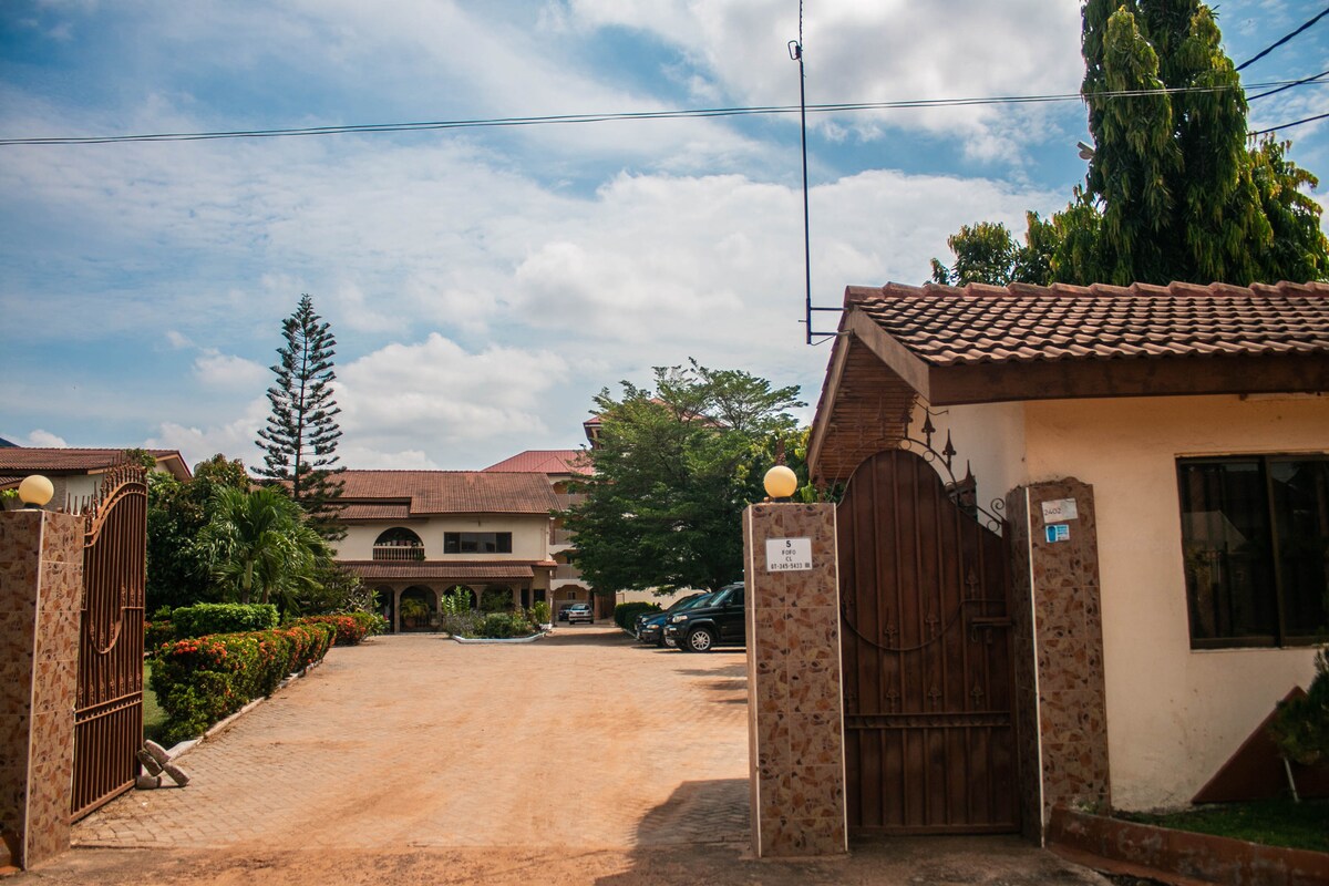 A prestigious boutique style accommodation unit not far from Kotoka International Airport and township of East-Legon. Fully equipped en suite 16 rooms and other features: - Wi-fi access - Flat Screen Tv's - Fully equipped wardrobes - Living room - Air conditioned rooms through out - Refrigerator in each room. - Generator unit. - Landscape garden