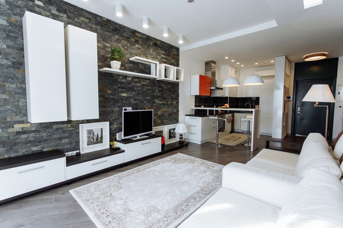 Relájate en un elegante apartamento en el corazón de Chisinau, con acabados de mármol y madera natural. Disfrutarás de un colchón Vi-Spring Bedstead de primera calidad, una bañera espaciosa y un balcón con chimenea decorativa. El departamento cuenta con cortinas de control remoto y una máquina de café espresso. El bloque se beneficia de recepción y seguridad 24/24, lo que le brinda seguridad, comodidad y tranquilidad adicionales durante su estancia.