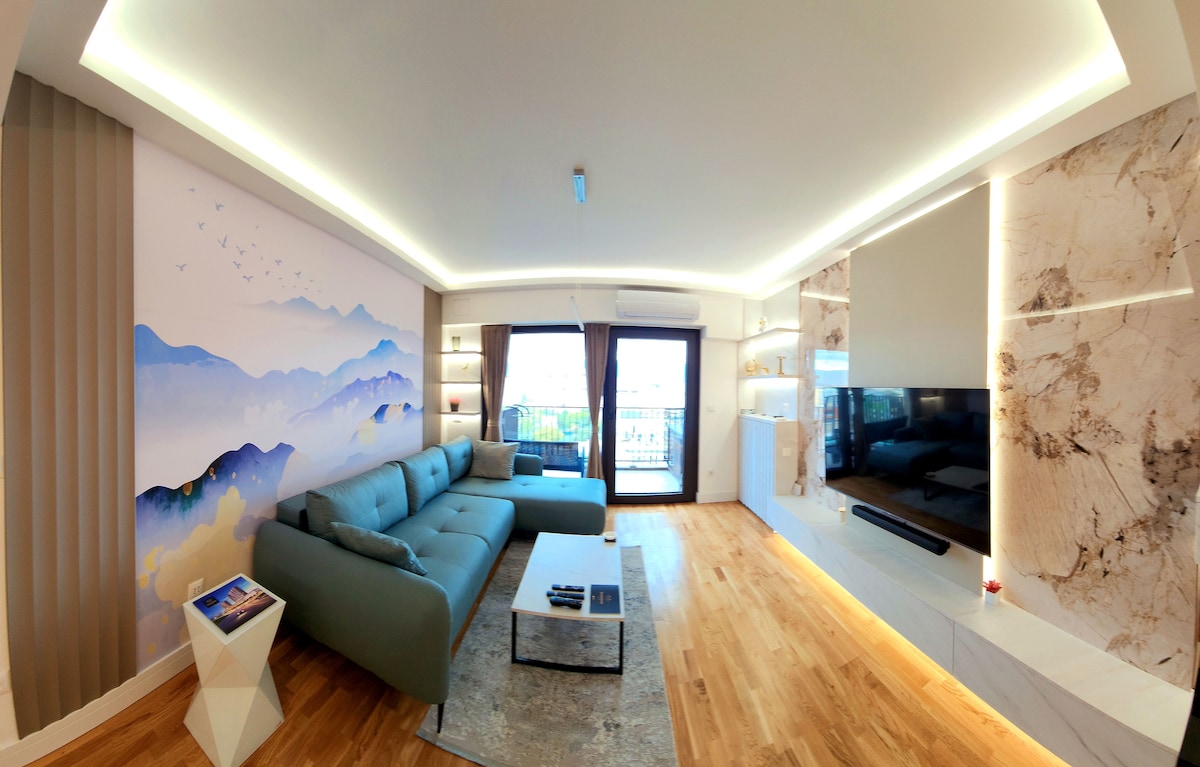 Disfruta del lujo del horizonte desde el piso 24 de Cevahir en este espacioso departamento de 82 m². Con dos dormitorios, una luminosa sala de estar/comedor, una cocina completa y un balcón de 15 m², es perfecto para un máximo de 4 huéspedes. Disfruta del gimnasio, el spa, la piscina, la cafetería y el centro comercial con supermercado en el lugar. Aparcamiento gratuito incluido. A solo 20 minutos del aeropuerto de Skopje, tu escapada elegante y relajante con vistas a la ciudad.