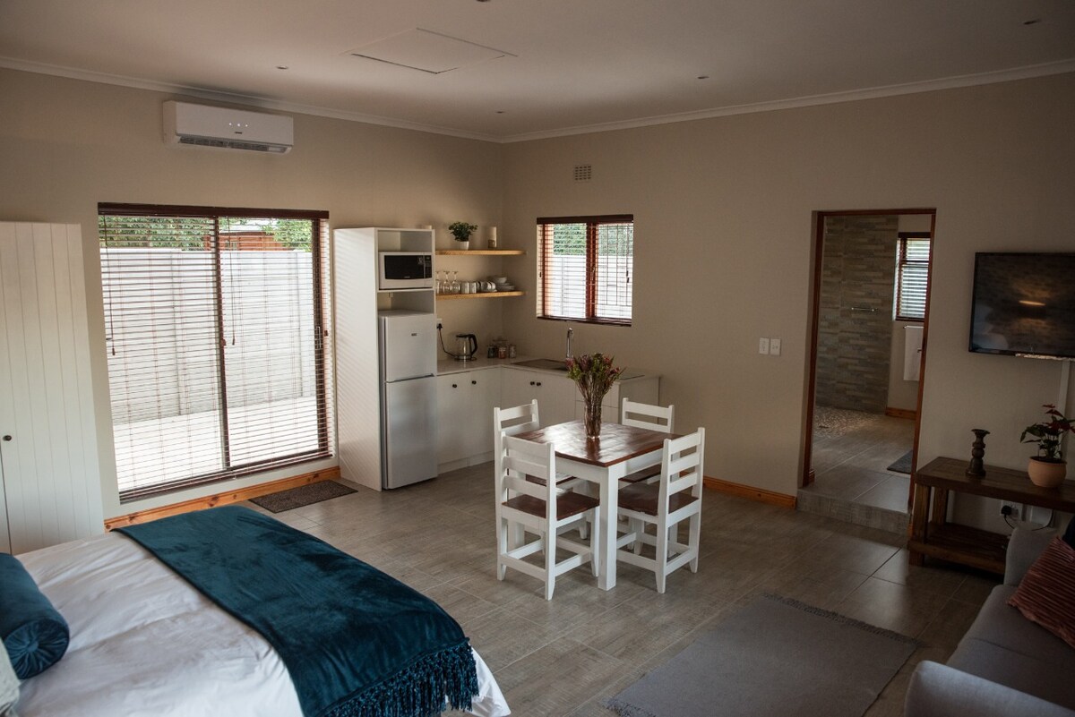 Un hermoso apartamento de huéspedes de planta abierta en Winelands. Tiene unas vistas magníficas, está muy bien amueblado y es tranquilo y silencioso. Hay una pequeña cocina (microondas, sin horno), baño privado (solo ducha), comedor y balcón. Es espacioso y luminoso. Los huéspedes pueden caminar por la granja para estirar las piernas y disfrutar de las hermosas vistas y el aire fresco o ver las cebras, los gacelos y los ñus en el campo de caza. Se encuentra a 7 km del centro de la ciudad de Stellenbosch.