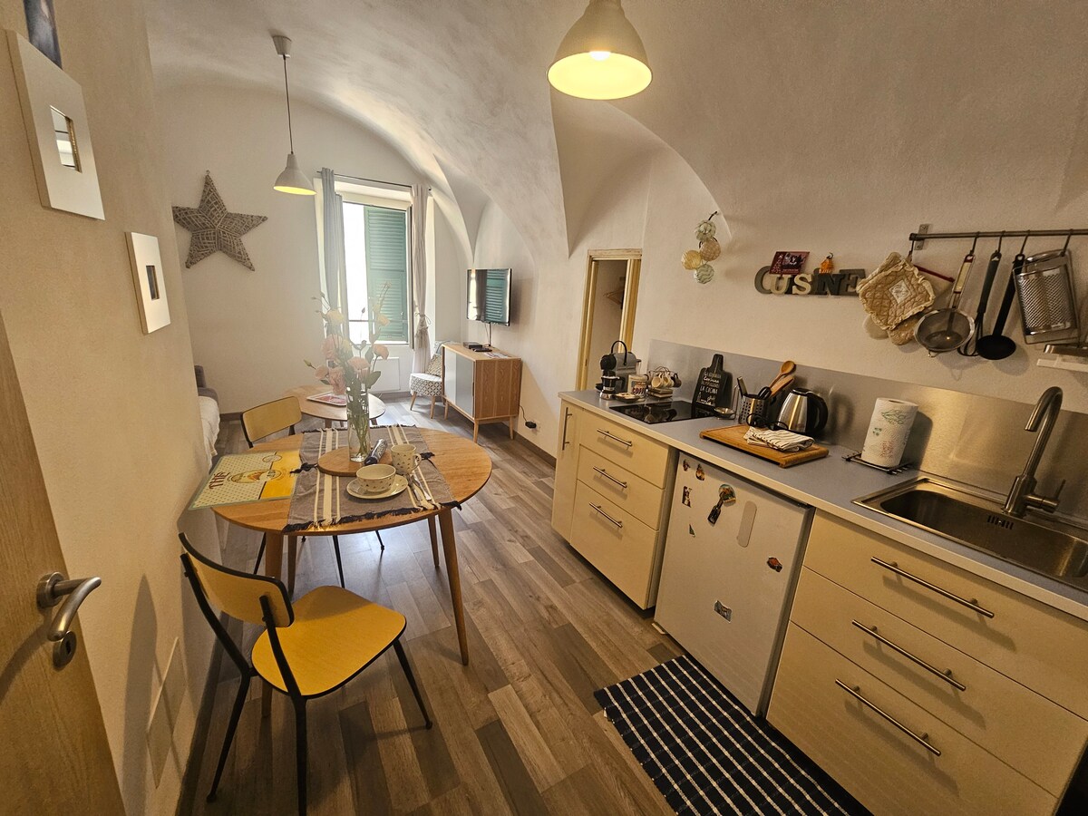 Un espacio sencillo y romántico, una habitación sin florituras con cocina americana y una pequeña terraza con vistas al río: desde aquí se puede ver un pequeño puente de piedra... y el sonido del agua que fluye. El alojamiento es una gran bóveda: toda la casa ha sido restaurada con materiales naturales, cal y barnices hechos con harina y aceite de lino. Para los meses de invierno hay una estufa de leña que los huéspedes pueden gestionar de forma independiente. Se proporciona leña para la estancia.