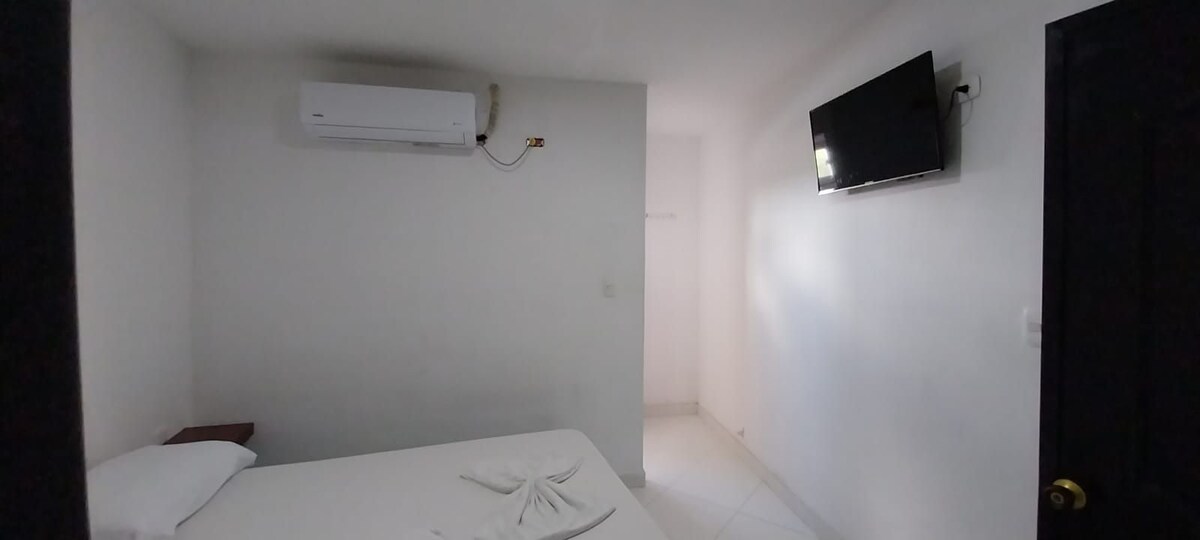 Disfruta de tu estadía en nuestro aparta estudio completamente amoblado, cuenta con cocina integral, nevera, dos sillas para bar, lavadora, tendedero, cama doble, sofá cama, colchón inflable, 2 TV pantalla plana, aire acondicionado, ventilador, ducha, servicios de agua, gas, energía y wifi incluidos, incluye toallas y sábanas limpias, jabón - shampoo, papel higiénico, Movistar TV. El espacio se puede adecuar con sofá cama y colchones inflables para 2 o 3 personas más.