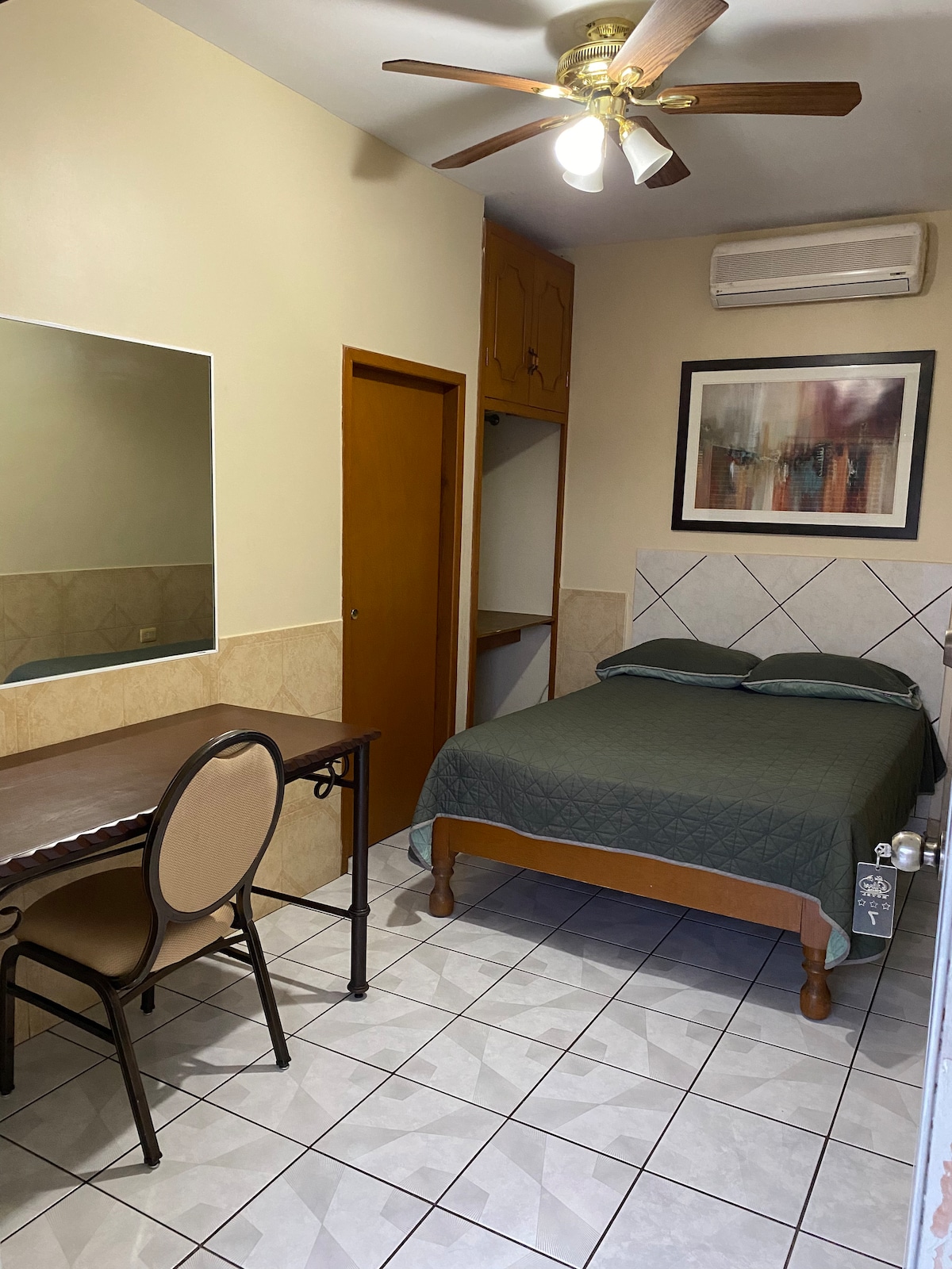 Habitación estilo colonial, con aire acondicionado, buena iluminación, espacio de trabajo y baño privado, se realiza limpieza diaria.