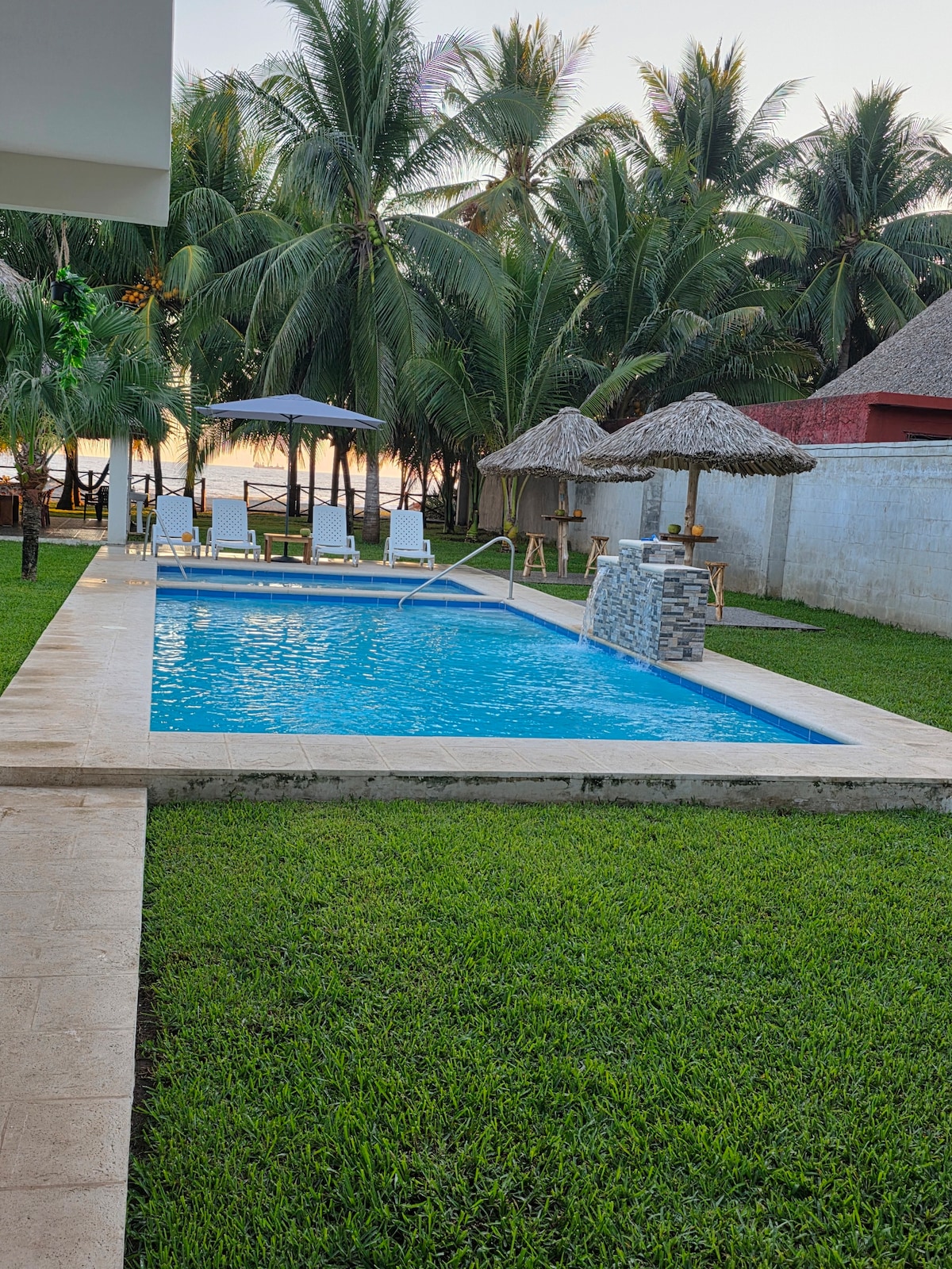 Welcome to your beachfront luxury escape! This stunning property offers everything for a perfect getaway—luxury finishes, a private pool, jacuzzi, and a spacious living room. With 3 bedrooms, each featuring 2 queen beds, and 4 bathrooms plus an outdoor shower, comfort is guaranteed. Relax in the lush garden with hammocks and let the ocean breeze rejuvenate you. Ideal for those seeking a serene and upscale retreat by the sea. Book your stay and indulge in coastal luxury!