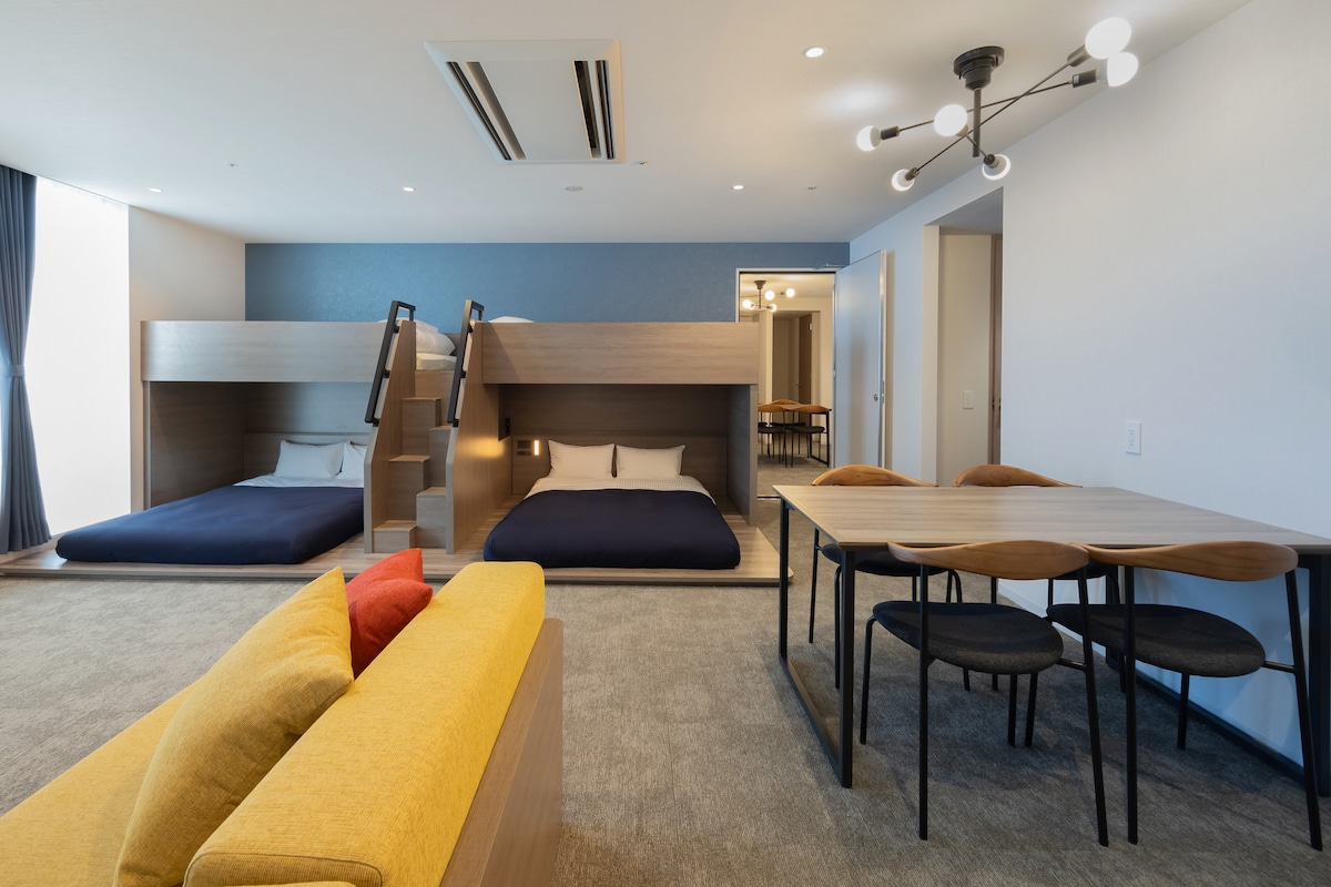 La amplia habitación de 107 ㎡ tiene 2 camas dobles, 2 literas y 4 sofás cama, y tiene capacidad para 14 personas. Minn se unió a la base de innovación abierta más grande de Japón, que nació en el lado sur del parque Tsurumai, ciudad de Nagoya, en octubre de 2024.Acelera el rendimiento de tu negocio con amplias habitaciones donde muchos socios comerciales pueden pasar tiempo juntos.El espacio compartido frente a la parte delantera del hotel tiene una azotea con vistas al parque Tsurumai, que tiene una gran sensación de liberación.El campo deportivo actual es vibrante. Además, Nagoya, una zona cultural única en Japón, también se recomienda como destino de viaje lleno de comida y un nuevo encanto de Japón. Hay una tienda en el edificio.