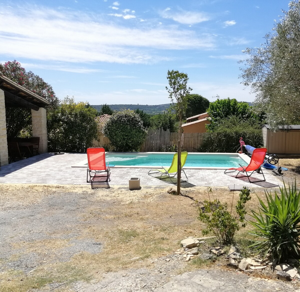 Ven a relajarte en nuestro hermoso jardín de flores (4000 m²). Solo tendrás que tomar cuatro pasos para sumergirte en la piscina, que mide 11 x 5 m. Todo es tranquilo aquí, aparte del canto de las cigarras y el vecino de los caballos cercanos. El alojamiento es nuevo, con un toque romántico. Tienes la opción de elegir entre 2 terrazas para disfrutar de las comidas. Nuestra casa está en el mismo terreno y estaremos a tu disposición si es necesario, pero la piscina y el jardín estarán reservados exclusivamente para ti.
