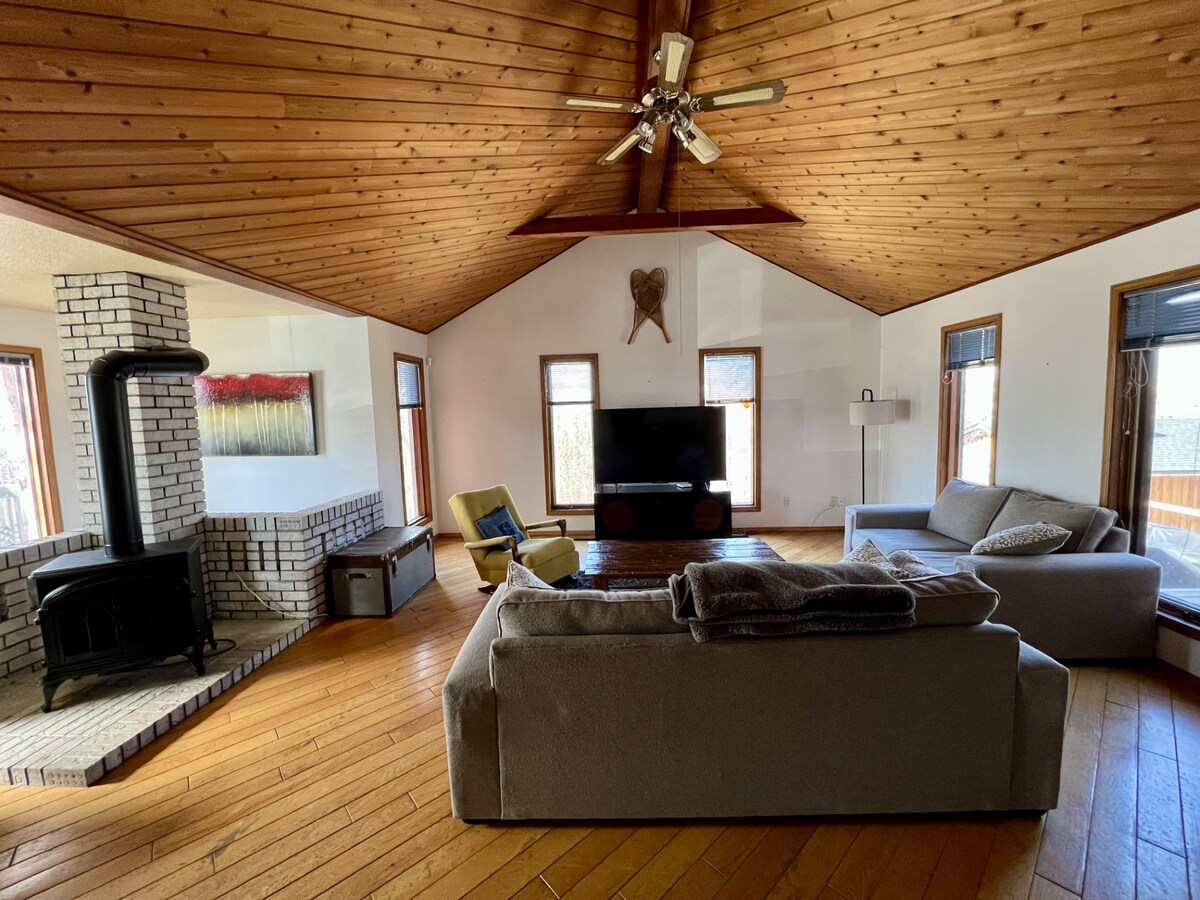 Cozy Cedar Retreat – Forest Views Steps from Downtown Welcome to your cozy cedar escape! This bright and spacious home features a cedar living room with vaulted ceilings and an electric fireplace. Cook with ease in the open kitchen with all-new appliances and an 8ft quartz island, perfect for hosting. Enjoy 5 comfy bedrooms, 2 renovated bathrooms, laundry, and a 3-tiered deck with fire pit, BBQ, and patio furniture on a half-acre lot. Steps from downtown, restaurants, coffee shops, and the lake!