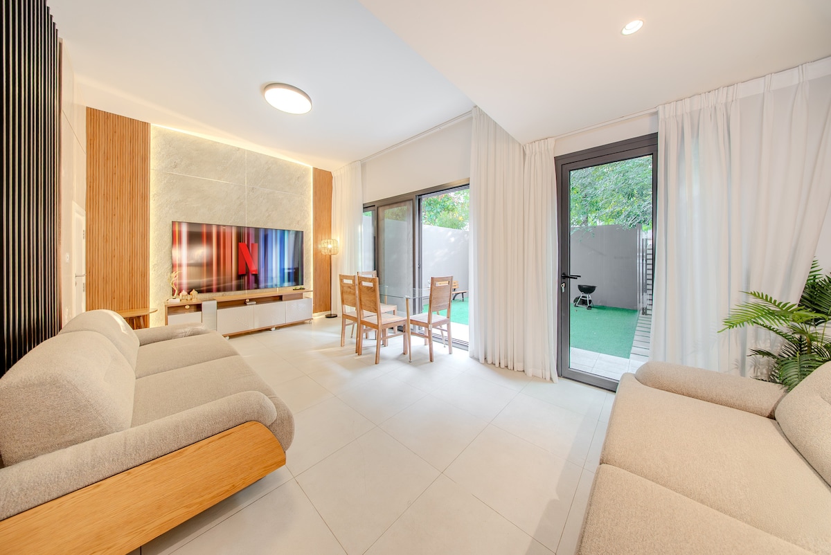 Bienvenido a esta moderna y elegante villa de 2 dormitorios, diseñada para ofrecer comodidad, privacidad y una estancia relajante para familias y amigos. La villa cuenta con una sala de estar luminosa y espaciosa con elegantes asientos y un televisor grande, perfecto para relajarse después de un largo día. Las ventanas del piso al techo permiten que la luz natural llene el espacio, creando un ambiente cálido y acogedor.