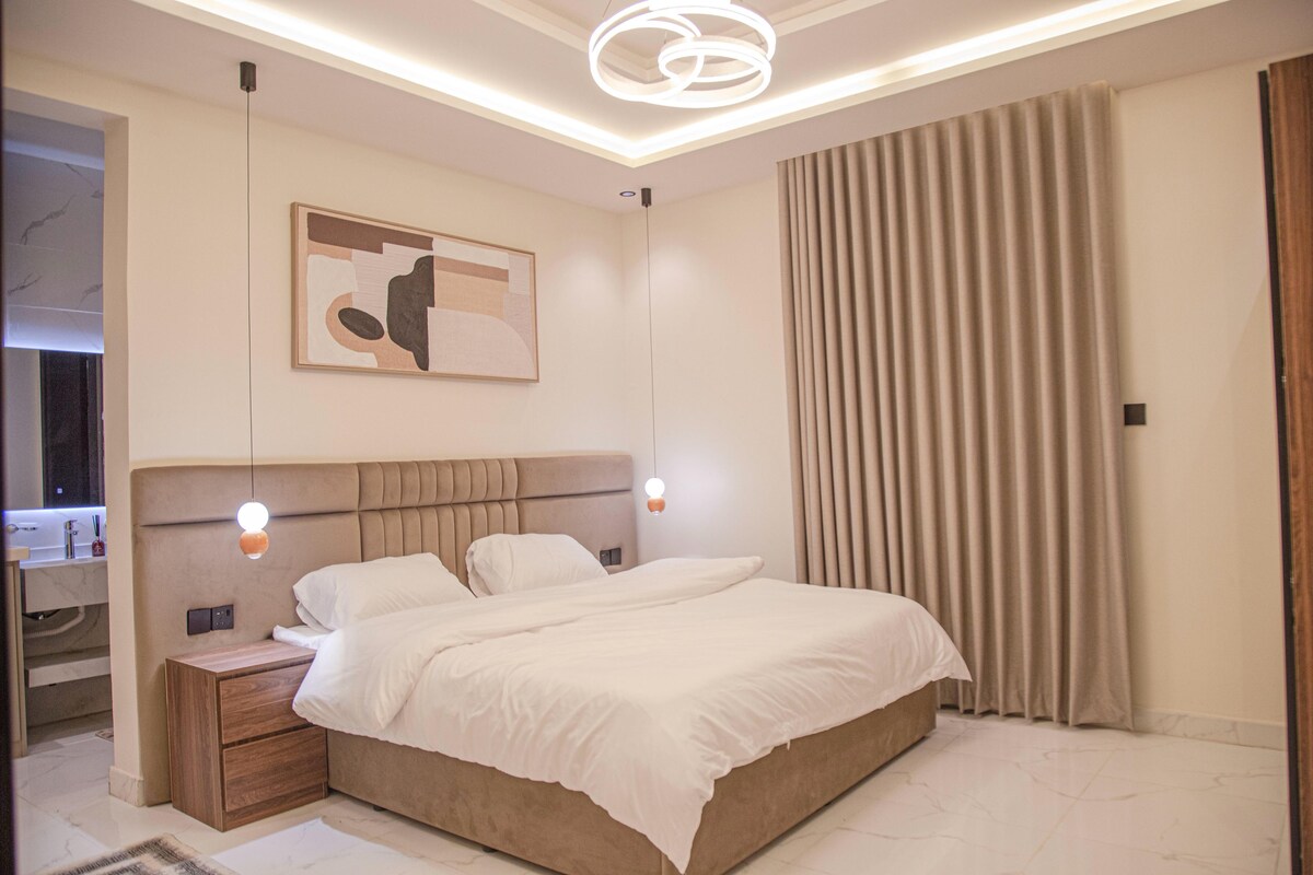 Relájate en este moderno departamento de estilo hotelero en Al-Faiha, una zona privilegiada de Jeddah. Cuenta con un cómodo dormitorio, acogedora sala de estar con un televisor inteligente de 65 pulgadas, comedor y cocina totalmente equipada. Disfruta de un baño moderno con ducha de lluvia, Internet de alta velocidad y estacionamiento. Cerca del centro comercial Al Salam, el centro comercial Al Andalus, la Universidad Rey Abdulaziz, hospitales y la estación de tren, ideal para estancias de negocios y de placer.