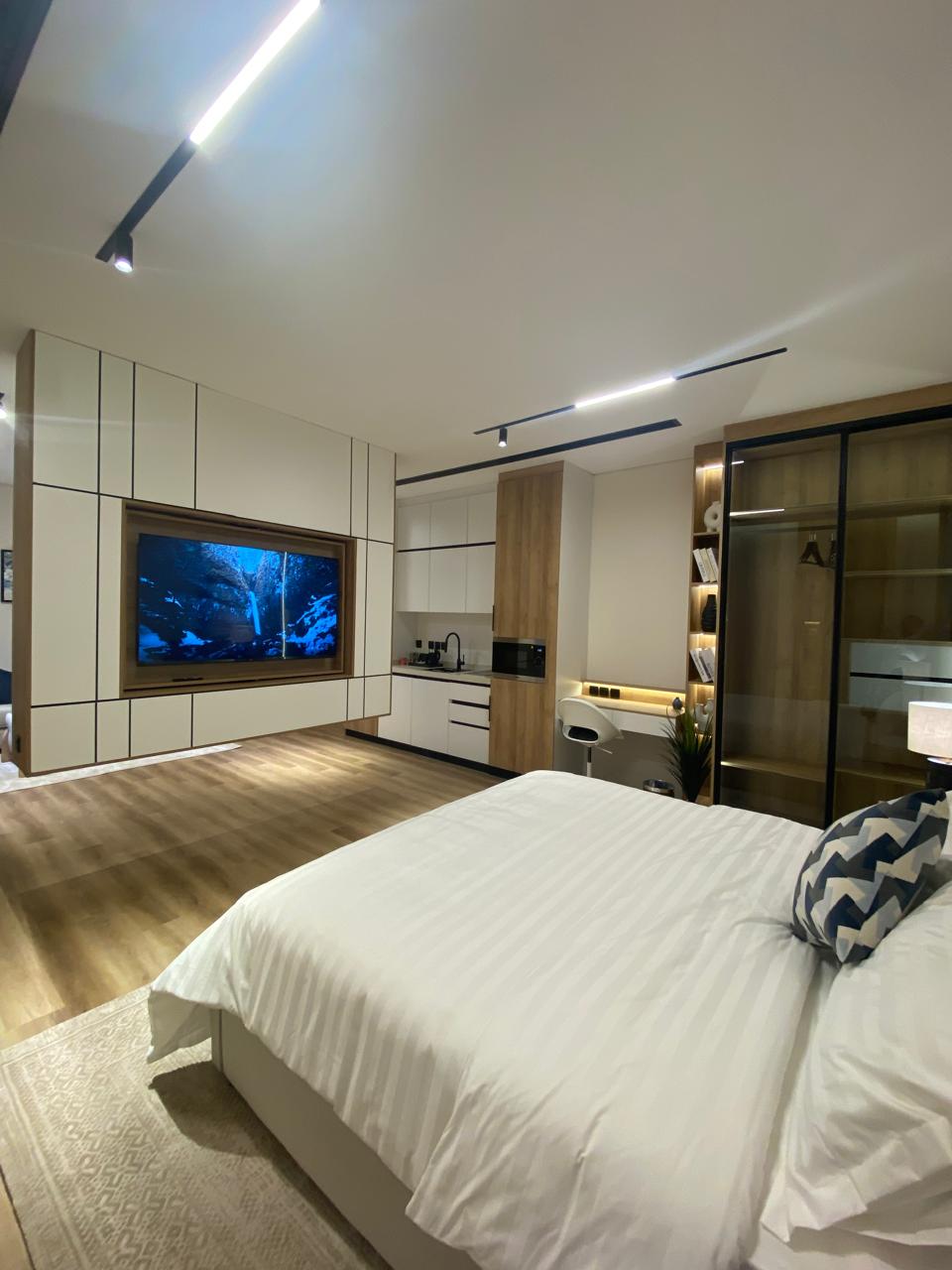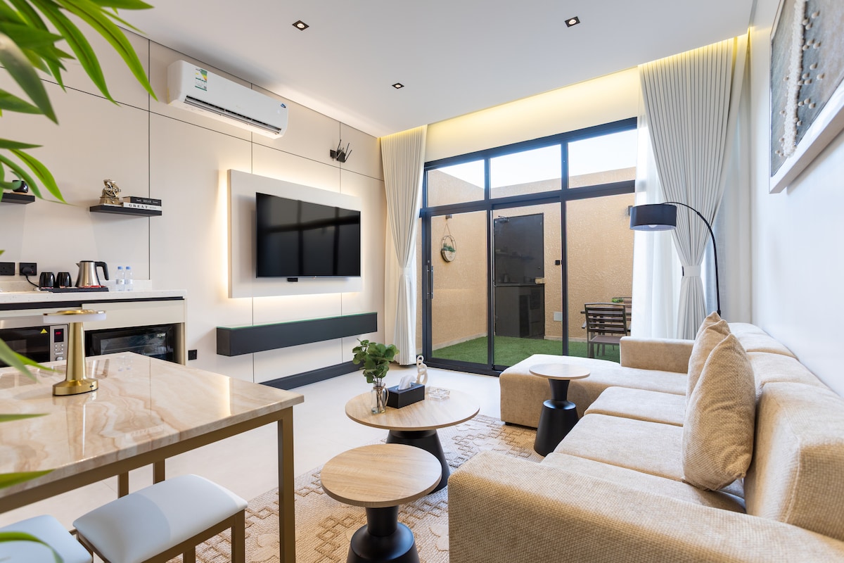 Un estudio elegante y tranquilo ubicado en la planta baja con acceso inteligente para mayor comodidad y seguridad. Tiene una cómoda cama principal y un sofá que es perfecto para relajarse. Equipado con una pantalla inteligente de 60 pulgadas con suscripciones a Netflix, Watch y YouTube Premium para una experiencia de entretenimiento completa. Hay conexión Wi-Fi rápida disponible, con una atención muy alta a la higiene para garantizar una estadía cómoda y perfecta.