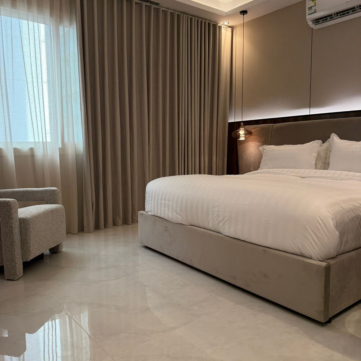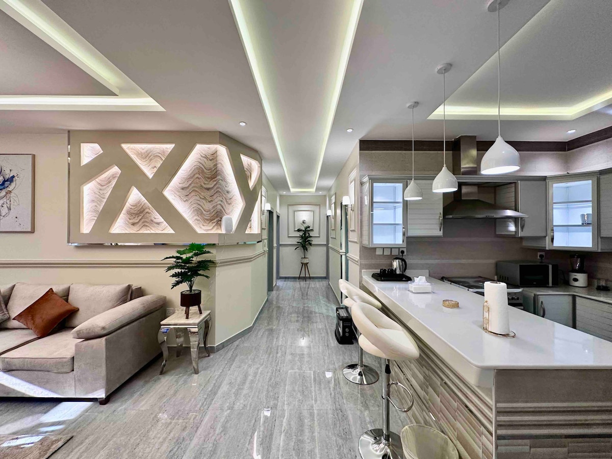 Disfruta de una experiencia de viaje maravillosa con tus seres queridos en uno de los apartamentos más lujosos del barrio de Olaya, en el centro de la ciudad. La ubicación se eligió con mucho cuidado en el centro de Riad y en el exclusivo barrio de Olaya. La vivienda está diseñada para que te sientas como en tu propia casa, ya que cuenta con todas las comodidades y entretenimiento. Se han utilizado electrodomésticos de alta calidad para ofrecerte un ambiente de lujo y exclusividad. Hemos elegido los mejores materiales de algodón, colchones y almohadas cómodas para que disfrutes de un sueño reparador. Lo mismo ocurre con el salón, que está amueblado con un sofá lujoso y cómodo. Puedes entrar en la casa a través de la cerradura inteligente.
