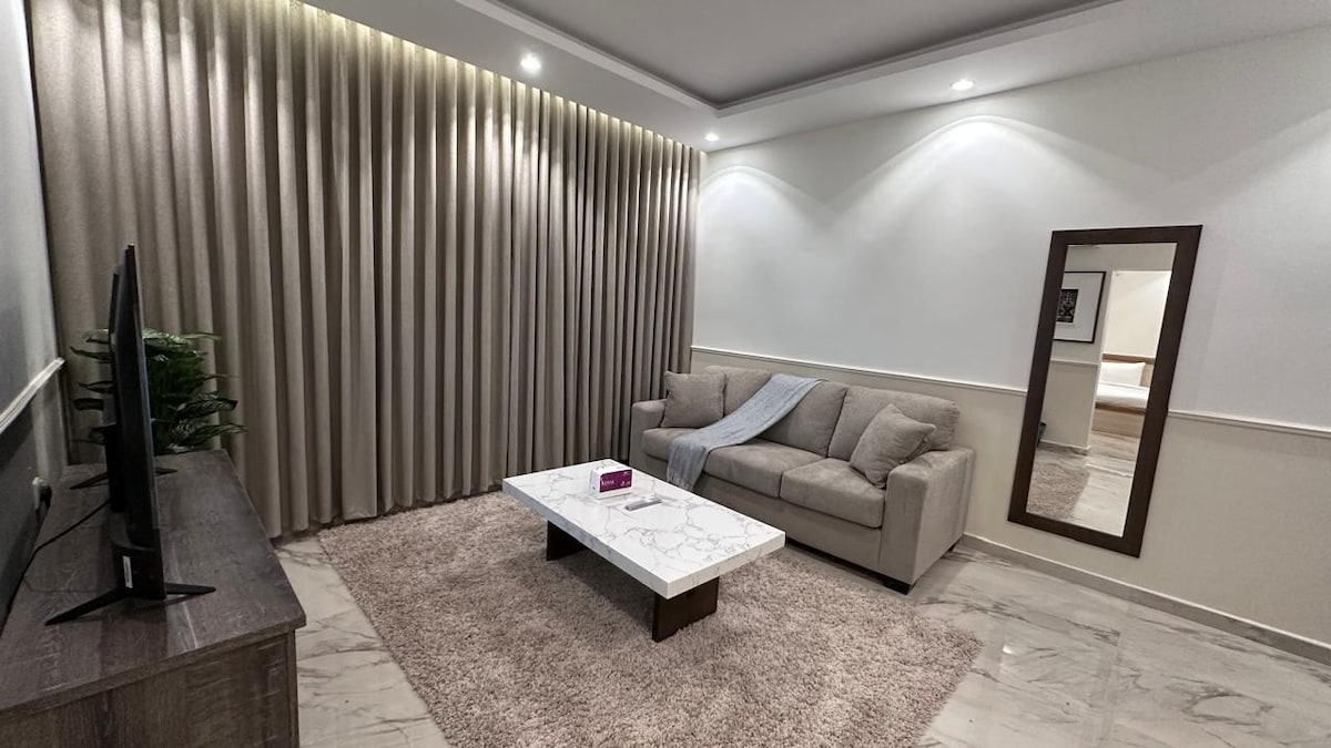 Apartamento tranquilo que consta de un dormitorio de lujo, una sala de estar, una cocina completa para cocinar sus comidas favoritas y un baño totalmente equipado - Está a 5 minutos en coche de la Mezquita del Profeta y a 3 minutos en coche de la Mezquita de Quba, y muy cerca de la Pasarela de Quba y la Mezquita de Jumma. 🕌 - Todos los servicios, restaurantes y tiendas están disponibles las 24 horas - Sofá para relajarse - Pantalla inteligente de 65 pulgadas conectada a wifi para que disfrutes viendo la televisión con la familia - La pantalla inteligente tiene todas las aplicaciones de Netflix y YouTube Bienvenidos a nuestra nueva residencia💜 Estamos a su disposición durante toda la estancia