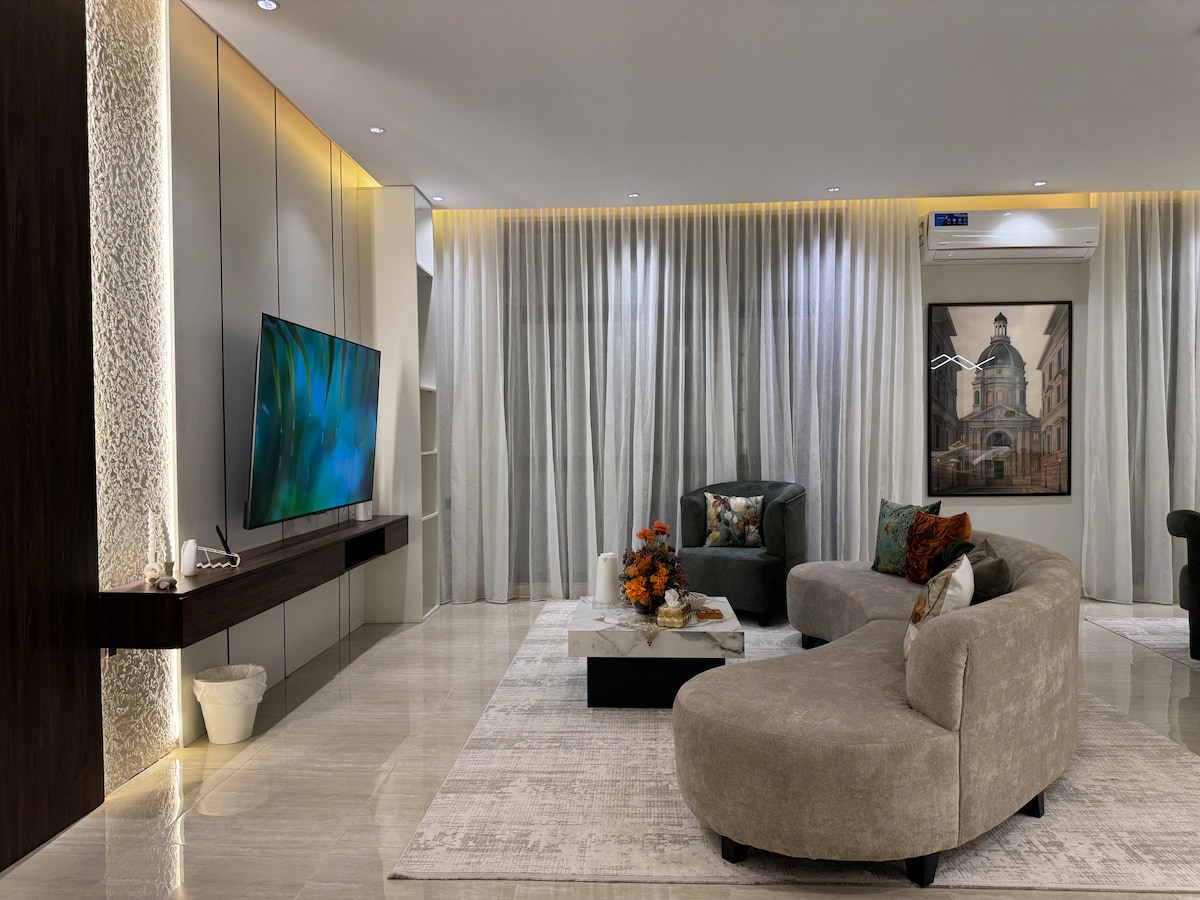 Disfruta con toda la familia en este elegante alojamiento. Apartamento moderno de lujo * Diseñado y equipado para su comodidad * Consta de dos habitaciones (master y habitación con 3 camas) Amplio salón abierto a la cocina moderna Diseño elegante (pantalla Samsung Smart WiFi) Cocina totalmente equipada - Frigorífico - Horno + microondas + lavadora - Todos los utensilios de cocina completos- - Fogones (gas/eléctricos) Además de la ubicación privilegiada A 8 minutos en coche de la estación de tren A 10 minutos en coche del aeropuerto A 5 minutos en coche de la mezquita de Quba A 15 minutos en coche de la Mezquita del Profeta