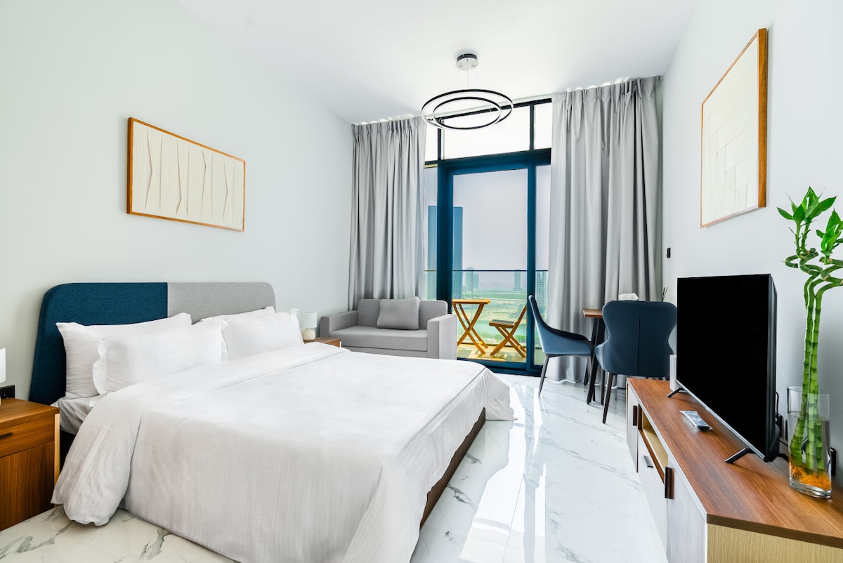 Bienvenido a mi espacioso estudio. En el interior hay una cama tamaño king y un sofá cama, con capacidad para 4 personas. Zona de oficina designada, equipada con una cómoda silla de escritorio y wifi para reuniones. Baño completo y cocina con todo lo necesario para estancias cortas o largas. El exterior cuenta con un gran balcón, con un acogedor banco para 3 personas y 2 mesas de cristal de estudio para disfrutar de un desayuno o café por la mañana. A 5 minutos del aeropuerto, a 10 minutos de la isla Yas, a 25 minutos del centro de Abu Dabi y a 50 minutos de Dubái.