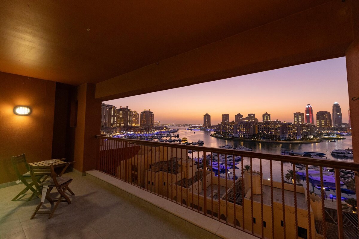 Despierta con brillantes vistas al puerto deportivo en este espacioso apartamento 1BR en Porto Arabia, The Pearl-Qatar. Disfruta de un balcón privado, cama tamaño king, 1,5 baños, cocina completa, armarios empotrados y una amplia sala de estar con un televisor inteligente de 65 pulgadas. Ideal para parejas, huéspedes solitarios o viajeros de negocios. Supermercado SPAR en la planta baja, además de cafeterías y tiendas cercanas. Incluye wifi rápido, estacionamiento, lavadora, sábanas limpias y seguridad las 24 horas. Tranquila, elegante y a unos pasos del agua, ¡tu escapada perfecta a Qatar!