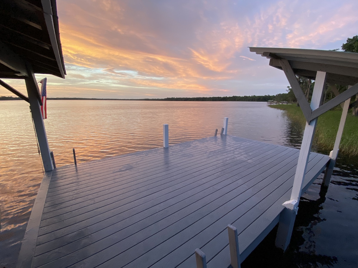 Nuestro patio delantero es el río Santa Fe. ¡Ven a disfrutar de un refugio en la naturaleza en esta casa de troncos de ciprés! Justo al lado de Tree House Spring y ubicado entre dos parques estatales, pero a menos de cinco minutos del centro de la ciudad. Ya sea que busques descanso y relajación o recreación, nuestro alojamiento ofrece ambos. Disfruta del paisaje y disfruta de la cena desde la orilla del río. Reclama bajo el sol en nuestro muelle (12’ x 12’). ¡Presta atención a las nutrias! Es un flotador de dos horas río abajo a Poe Springs, Rum Island y Blue Springs.