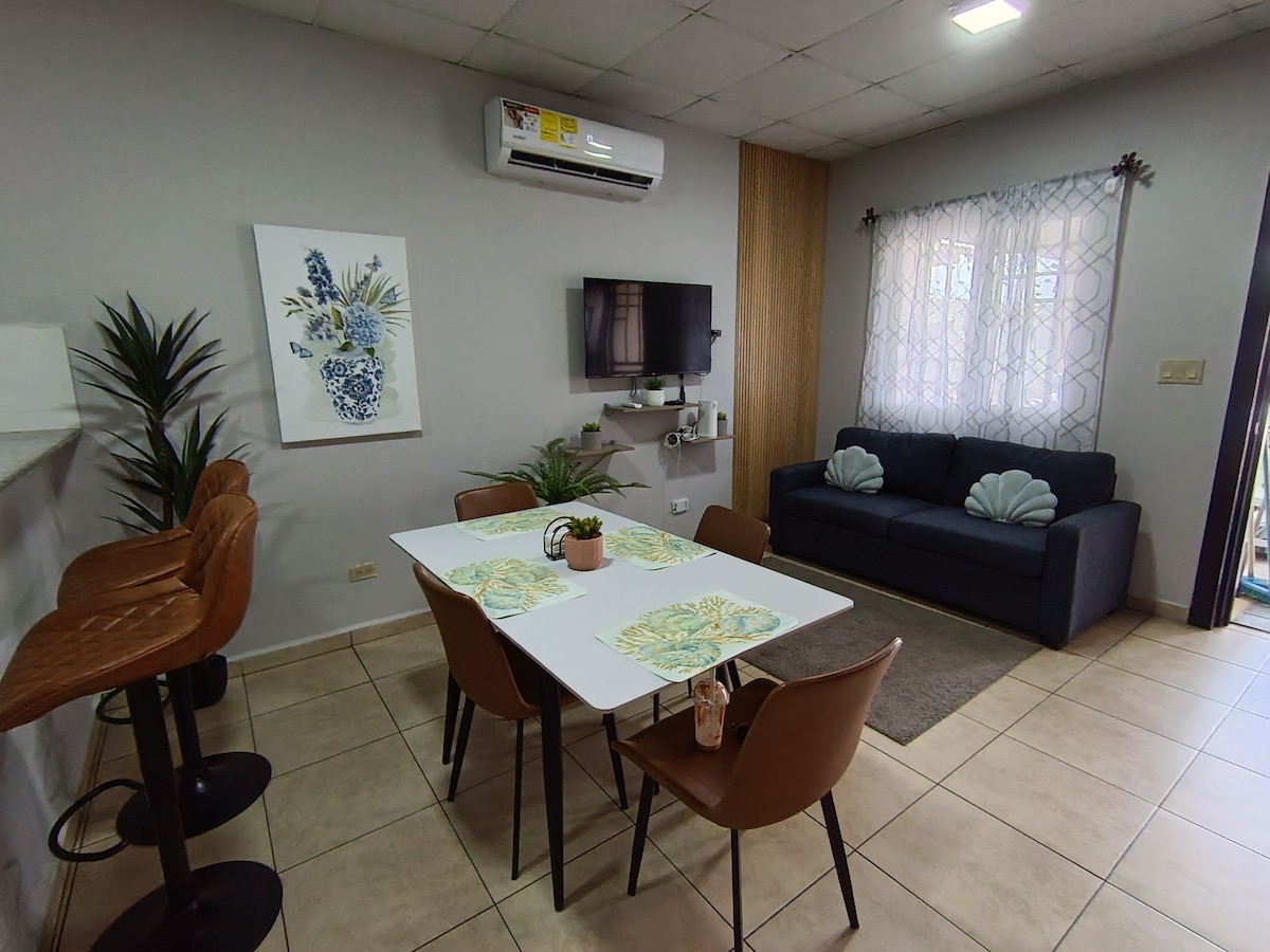 Disfruta de la sencillez de este alojamiento tranquilo y céntrico para 4 huespedes en el área de David. El alojamiento cuenta con dos récamaras (1 con cama queen y otra con cama full), un amplio baño con agua caliente, cocina bien equipada, sala con televisión por cable, netflix y amazon prime, comedor, lavandería completa, aire acondicionado en sala y ambos cuartos. Cercano a gimnasio, supermercado, restaurantes y a sólo 5 minutos del centro de David.