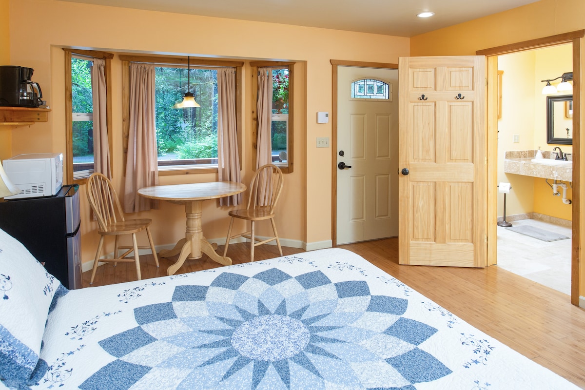Room One at Steller Inn es el alojamiento perfecto para tu viaje a Seward. Esta habitación de «estilo europeo» tiene su propio baño privado e independiente al que se accede por un pasillo cubierto al aire libre, a unos 25 pies de la habitación. El baño se puede cerrar con llave y cuenta con una ducha, inodoro y lavabo con azulejos preciosos. ¡Se proporcionan albornoces de spa para uso de los huéspedes durante su estancia! Una zona de estar al aire libre da a los jardines.