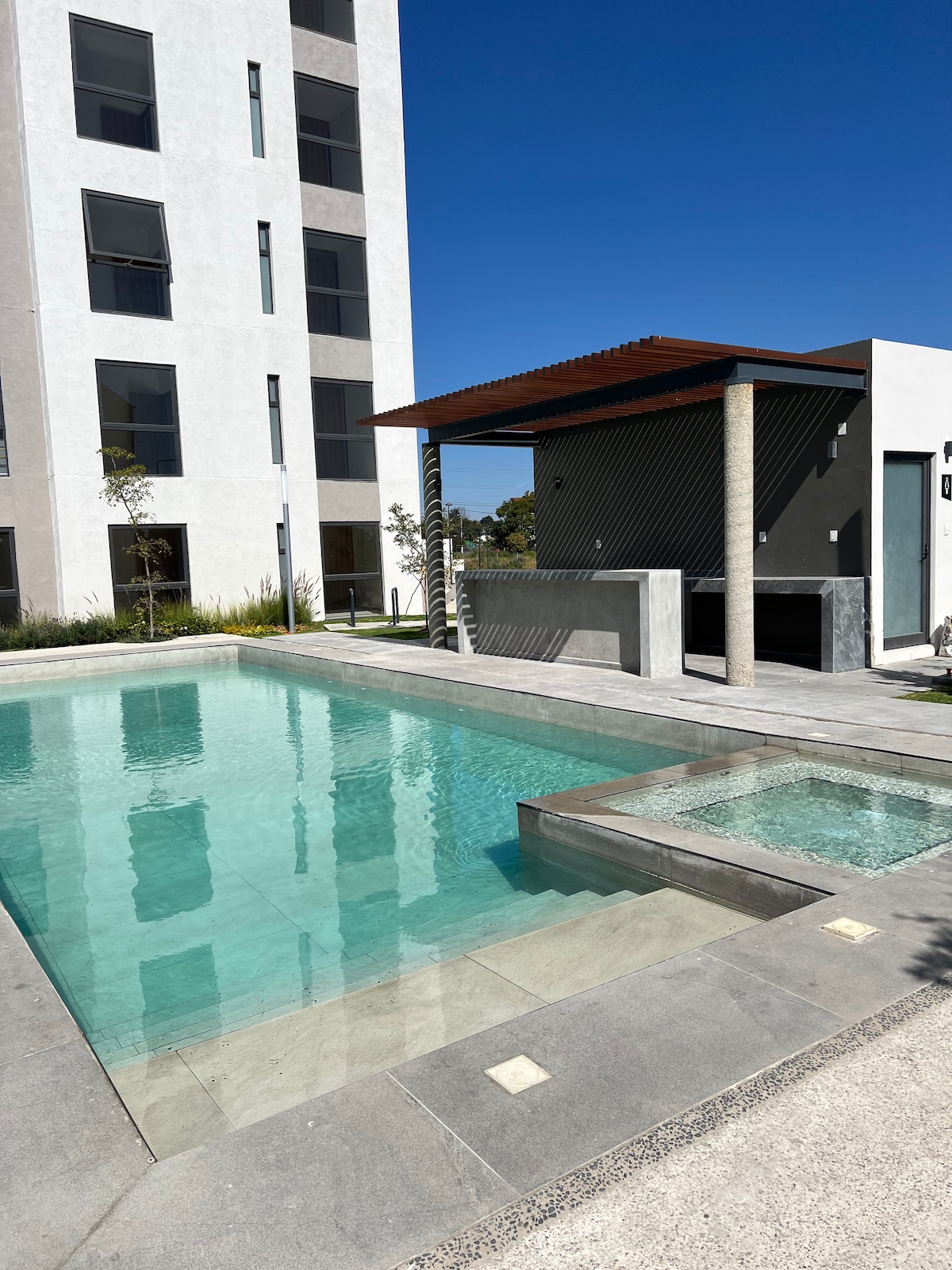 Acogedor departamento nuevo a solo 5 min. de salones de eventos como Hacienda La Escoba, La Magdalena, Casa Clementina, La Benazuza, La Tara. Relájate en este espacio tranquilo con una vista hermosa. Habitación ppal: 1 cama matrimonial Estudio: 1 sofá cama matrimonial El edificio cuenta con seguridad, cajón de estacionamiento y alberca, el departamento se encuentra en una zona muy tranquila donde alrededor podrá encontrar, cruz verde, farmacias,tiendas, gimnasios etc.