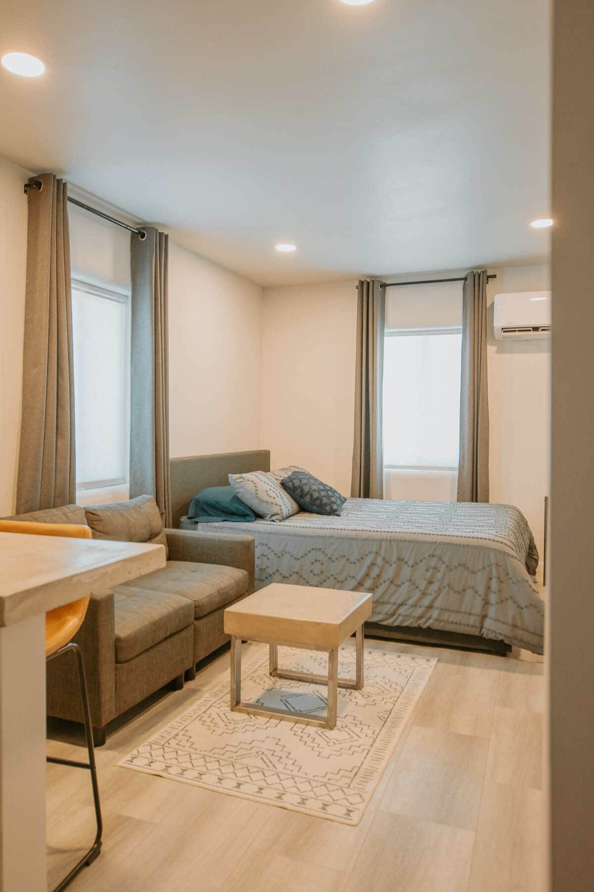 Cómodo estudio con cocina completa y baño grande y moderno. ¡Lavadora y secadora privadas incluidas! ¡Estacionamiento seguro fuera de la calle! Todos los electrodomésticos y muebles nuevos. Control de clima mini-split y wifi incluido. Excelente ubicación céntrica con acceso rápido a tiendas de comestibles, restaurantes, bares, cervecerías, autopistas, Old Town Plaza, tiendas, museos, Indian Pueblo Cultural Center, centro de la ciudad, centro de convenciones y acceso al río Grande.