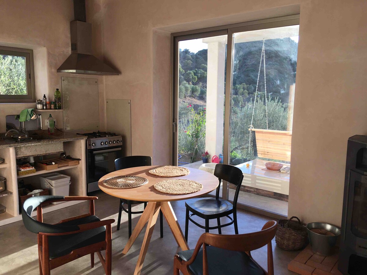Mein nagelneues Öko-Haus liegt in einem kleinen Tal inmitten von unberührter Natur ganz in der Nähe des Naturparks unweit von Grazalema und mit vielen Wanderwegen ringsum und in der Nähe des Embalse de Zahara. Beim Bau haben wir auf natürliche und recyclete Materialien gesetzt und Strom liefert die Sonne via Solaranlage. Auf den 3,5 Hektar Land befinden sich hauptsächlich Olivenbäume und von ganz oben hat mein eine wunderschöne Aussicht auf die Sierra de Grazalema.