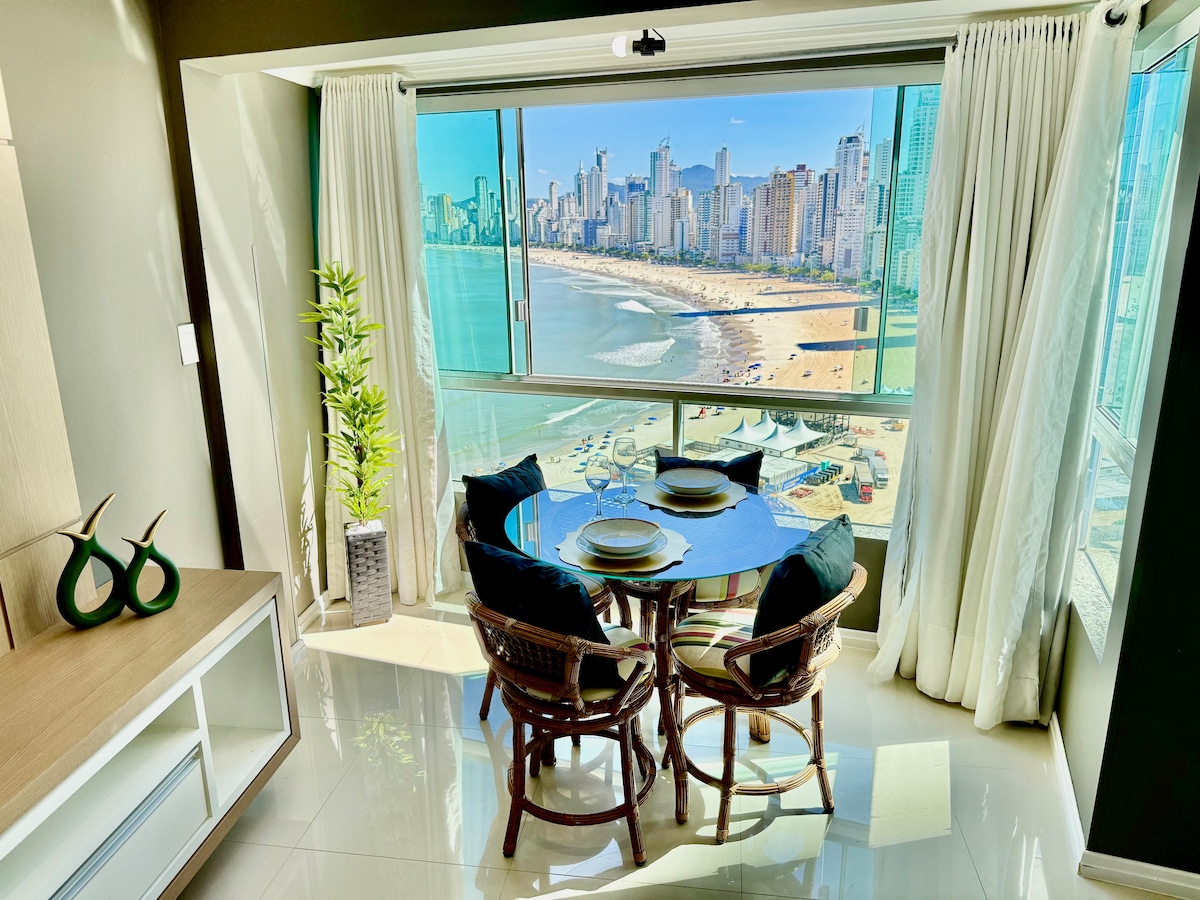 Hermoso apartamento a pie de playa con acceso exclusivo a la playa. Ofrece comodidad para hasta 5 personas, totalmente equipado con un estilo moderno y único. Gran ambiente familiar con muchas opciones de ocio: Piscina infinita y jacuzzi Piscina infantil Bar húmedo Piscina termal Solarium Sala de juegos Sauna Estudio de Fitness y Pilates Pistas deportivas Cine Espacio Kids y Playground Espacio Gourmet y Salón de Fiestas Espacio Pet Estacionamiento Acceso al Parque Beto Carrero en 15 min. Se admiten mascotas