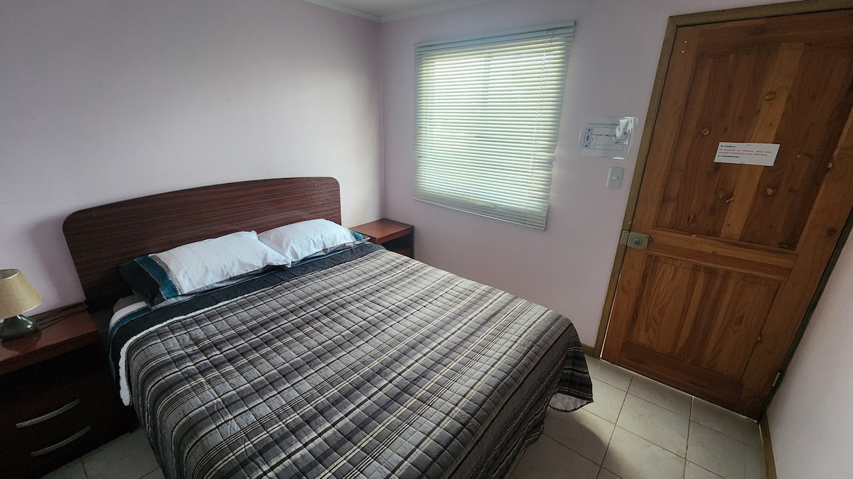 Acogedor departamento interior, independiente, cuenta con 1 cama de dos plazas, cómoda, velador, lámpara, baño y cocina independiente, agua caliente (calefont), cocina equipada con refrigerador, hervidor de agua, cocina con horno, horno microondas, utensilios. Comedorcito para dos, para servir los alimentos o trabajar en computador. Zona WIFI. Un amplio quincho techado y una pequeña piscina, una mesa de ping pong para los más deportistas. Es un lugar tranquilo, con jardines, cercano al centro.