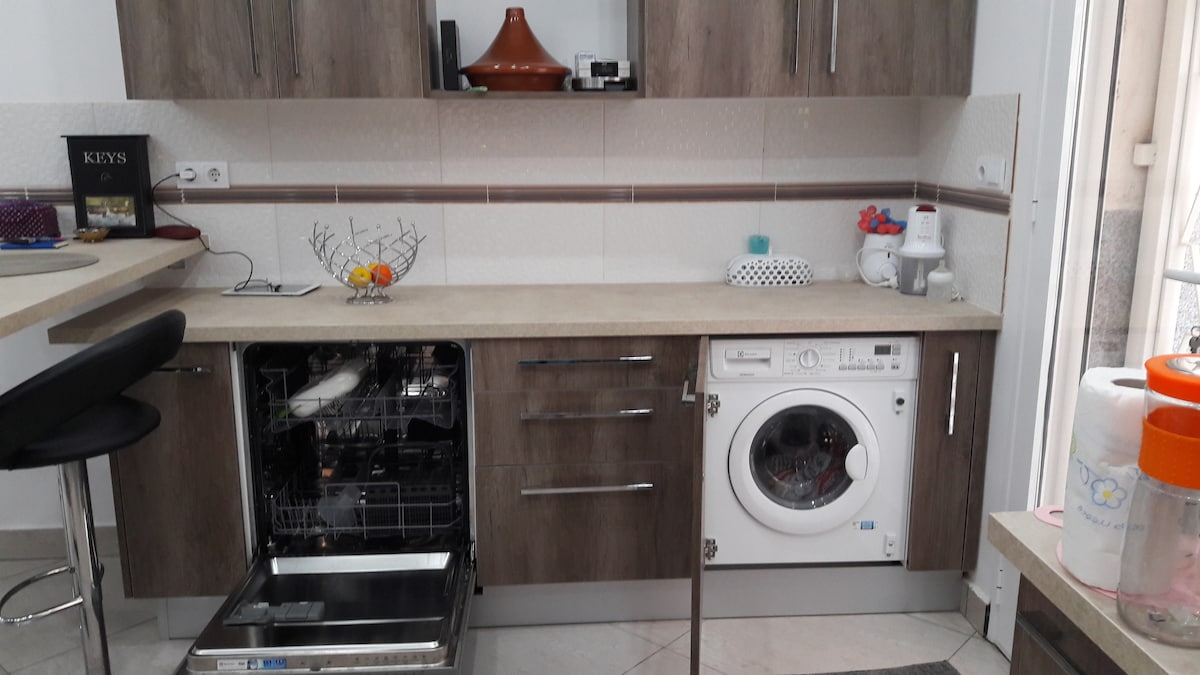 Grand appartement au 1 er étage. Moderne, confortable pour un excellent séjours (clim, wifi, TV..) trois chambres, un salon et cuisine ouverte, salle de bain et WC. C'est l'endroit idéal pour une famille, touristes ou voyageurs d'affaires. Cest un coin calme et paisible. À 5 minutes d l'autoroute. À 20 minutes de l'aéroport et du port d'Alger. Au Coeur de la wilaya d'Alger. L'appartement se trouvant à Tixeraine, adossè au parc d'attraction et zoologique. 1 place parking dans un garage