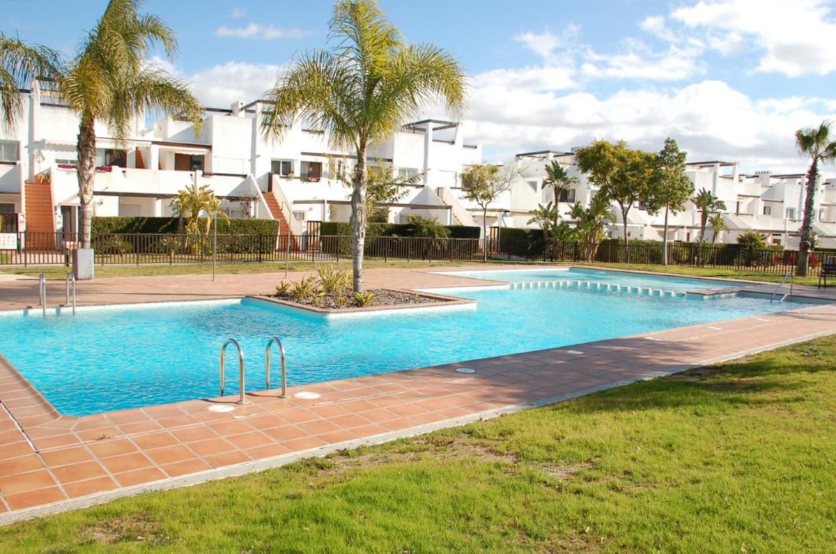 Número de turismo de Murcia VV,MU,8660-1 ¡Apartamento de 2 dormitorios apto para familias en Condado de Alhama, con solárium y balcón en la azotea! ¡Piscina comunitaria a 60 minutos y pequeña zona de juegos para niños frente al apartamento! En el centro vacacional cerrado Condado de Alhama que contiene un supermercado Spar. Bares, restaurantes, etc. A 300 metros de la casa club exclusiva de Alhama Las tarifas de limpieza se pagan con la reservación, por lo que no se deben pagar tarifas adicionales localmente. La ropa de cama se proporciona de forma gratuita.