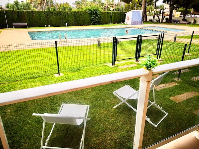 Uno de los mayores atractivos de este apartamento, es la magnífica piscina situada a escasos metros de la entrada de la vivienda. Los huéspedes podrán relajarse en la terraza con vistas a la piscina, mientras disfrutan de su bebida favorita. El apartamento está situado dentro de una urbanización muy tranquila. Dispone de cocina americana equipada con lavadora, tostadora, microondas, cafetera y frigorífico. La playa se encuentra a 10 minutos caminando, y hay un supermercado CONSUM a 200 metros.