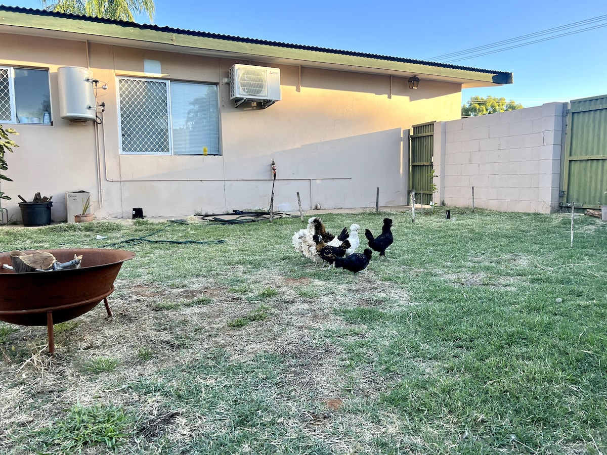 Uniquely Mparntwe-Alice Springs, in the heart of Gillen, a 2 bedroom, one bathroom mini home with a spacious yard for you and your travelling buddies. It's homely and comfortable, and enough yard room to bring your pets. Share your morning cuppa or your afternoon sunset viewing with the mini chickens - its the perfect base to plan and reset after your Central Australia exploring days!
