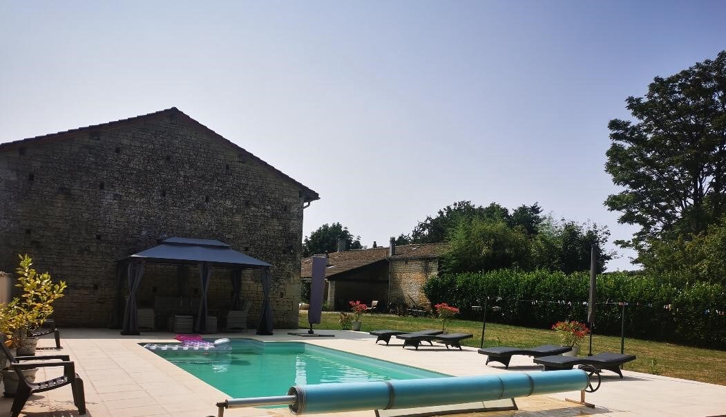 Traditional stone built first floor studio apartment with stylish, contemporary kitchen and bathroom. Outside is an enclosed space for al fresco dining and a splash pool to unwind with a glass of wine. in the privacy of this enclosed space.Situated in a small hamlet a few minutes from the historic market town of Melle and an hour's drive from the stunning city of La Rochelle. Includes a double bed and double sofa bed could have 2 adults, 2 children or 4 people for short stay! Sorry no pets!
