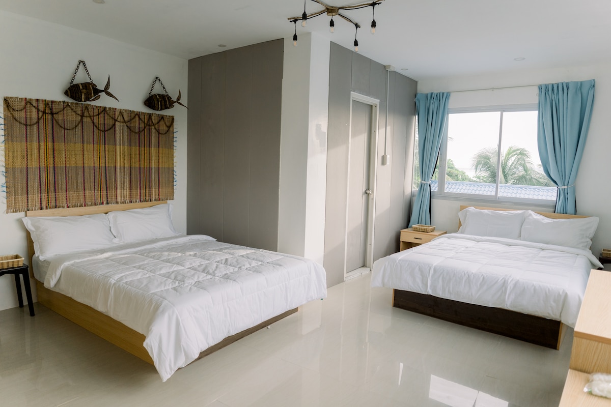 Habitación luminosa y acogedora con un diseño inspirado en la playa, ¡perfecta para tu escapada a la isla! Cuenta con dos cómodas camas dobles, aire acondicionado y muebles de madera. La encantadora decoración incluye arte mural de temática marina. Ideal para relajarse o como base para explorar las playas vírgenes y la vida marina de Bohol Island. ¡Disfruta de una estancia serena y elegante en el paraíso!