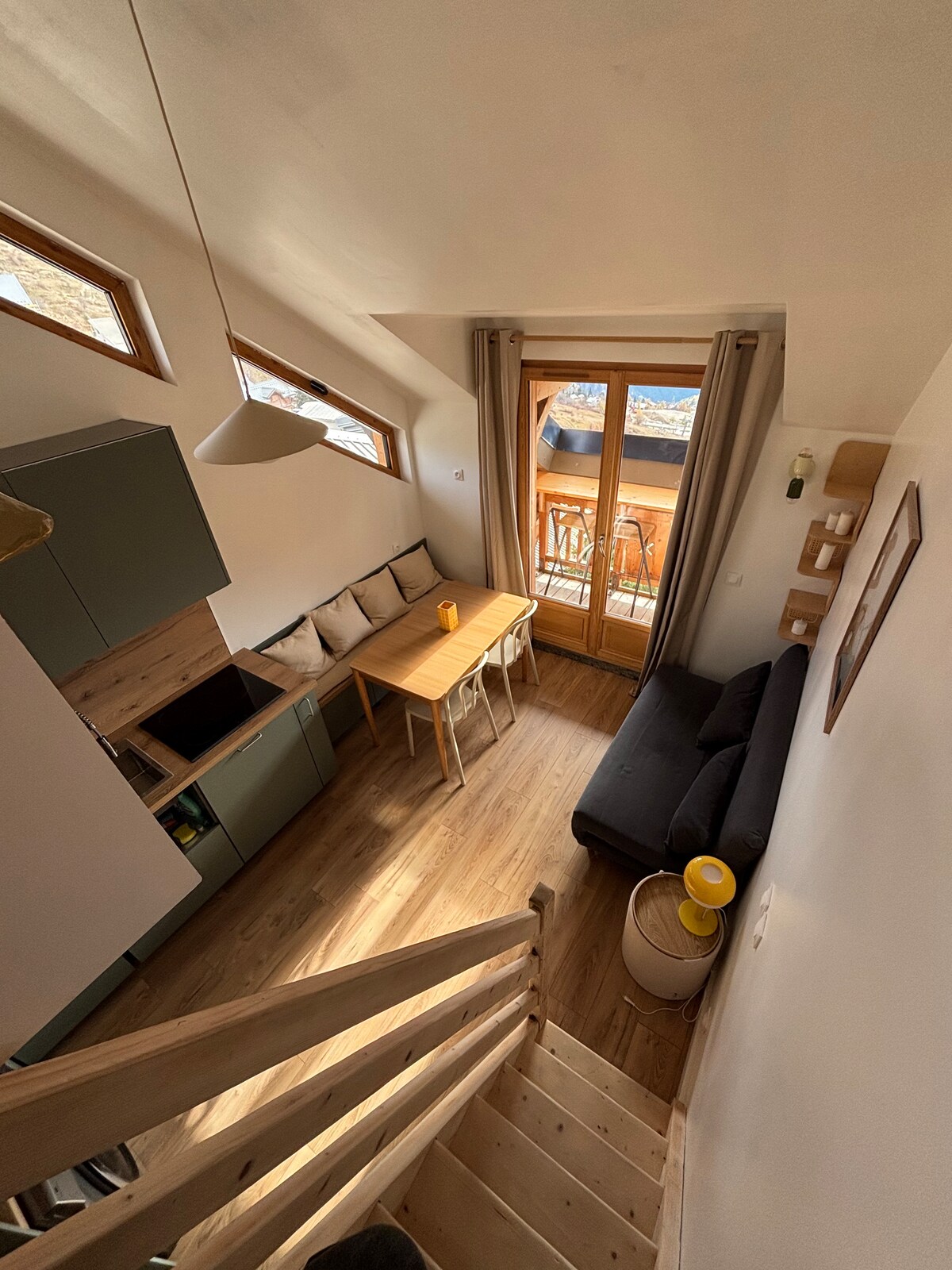 Estudio muy luminoso para 4 personas situado en la planta baja de una residencia tranquila en el centro de la estación, en el barrio de Jeux (cerca del Palacio de Deportes, la pista de hielo y las tiendas). Balcón orientado al sur con muebles de exterior. Gran sala de estar con un sofá cama de 140 cm + sala de estar cerrada con 2 literas de 90 cm y un gran vestidor. Cocina americana equipada con lavavajillas, microondas, horno, vitrocerámica, cafetera de cápsulas.