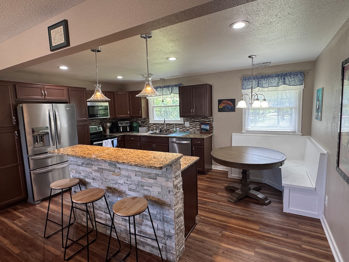 This is the perfect home for group trips. Ideal for multi-generation families or friends w/ kids! Comfortably sleeps 6 adults + 4 Singles/Kids 3 King Beds + 4 Twin Beds + 1 Pack-n-Play Every bedroom has its own bathroom! Kitchen has all of the essentials + more for your home-chef! Enjoy large dining table & a living room designed to encourage everyone to connect & relax! Sunporch & backyard patio for those perfect evenings + gas grill.