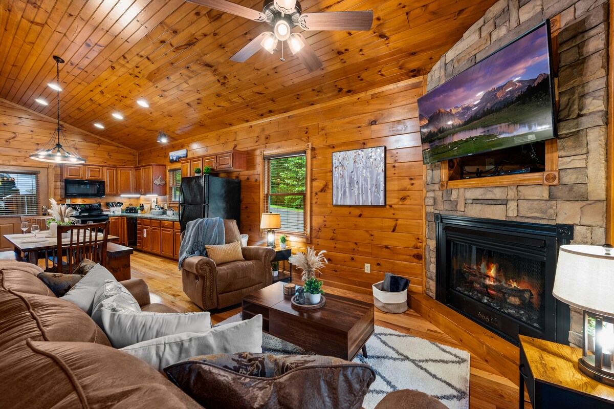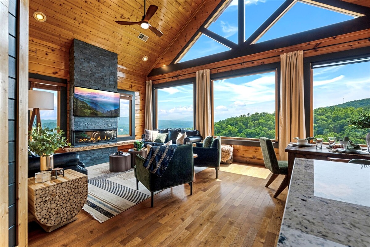 Come enjoy the spectacular views at The Overlook where you will be surrounded by trees while relaxing in this luxurious newly built cabin. Cozy up with a warm beverage while streaming your favorite show in front of the fireplace or challenge companions to a game, there is plenty to keep everyone entertained. Featuring floor to ceiling windows on both levels and 4 unique patios you will enjoy the views both inside and out with an unobstructed view. You won't want to leave this beautiful space!