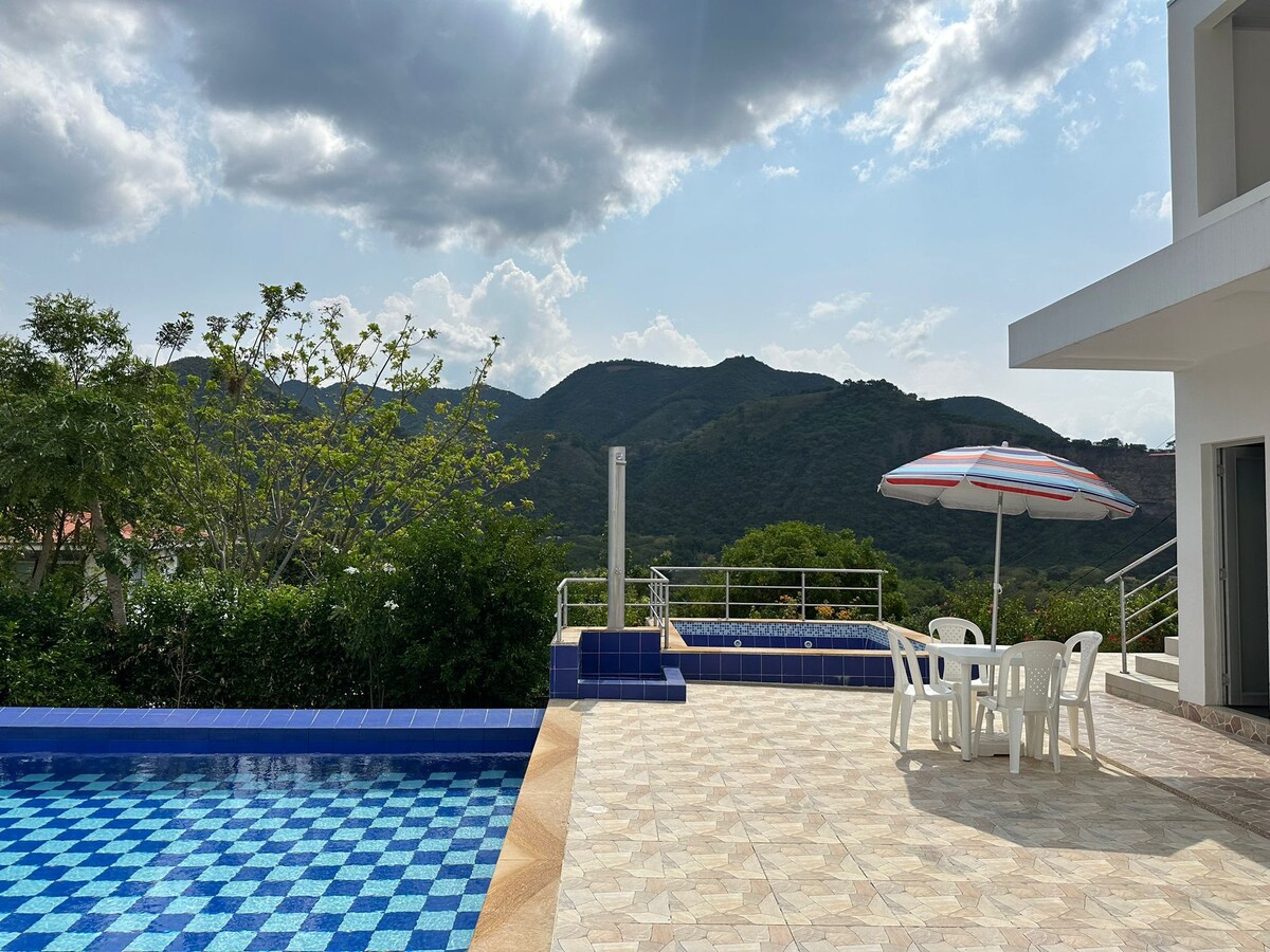 Casa vacacional cerca de Anapoima, con una de las mejores vistas de Colombia. Ideal para descansar o hacer teletrabajo rodeado de naturaleza. Ubicada en un conjunto cerrado y seguro, cuenta con: 🏊♀️ Piscina privada con vista panorámica 🛁 Jacuzzi con agua caliente 📶 Wifi de alta velocidad (ideal para teletrabajo) 📺 Televisión nacional y Netflix 🌬️ Ventiladores 🔥 BBQ a gas y zona exterior 🌞 Sillas para tomar el sol 🌳 Entorno tranquilo y privado 🐾 Pet friendly