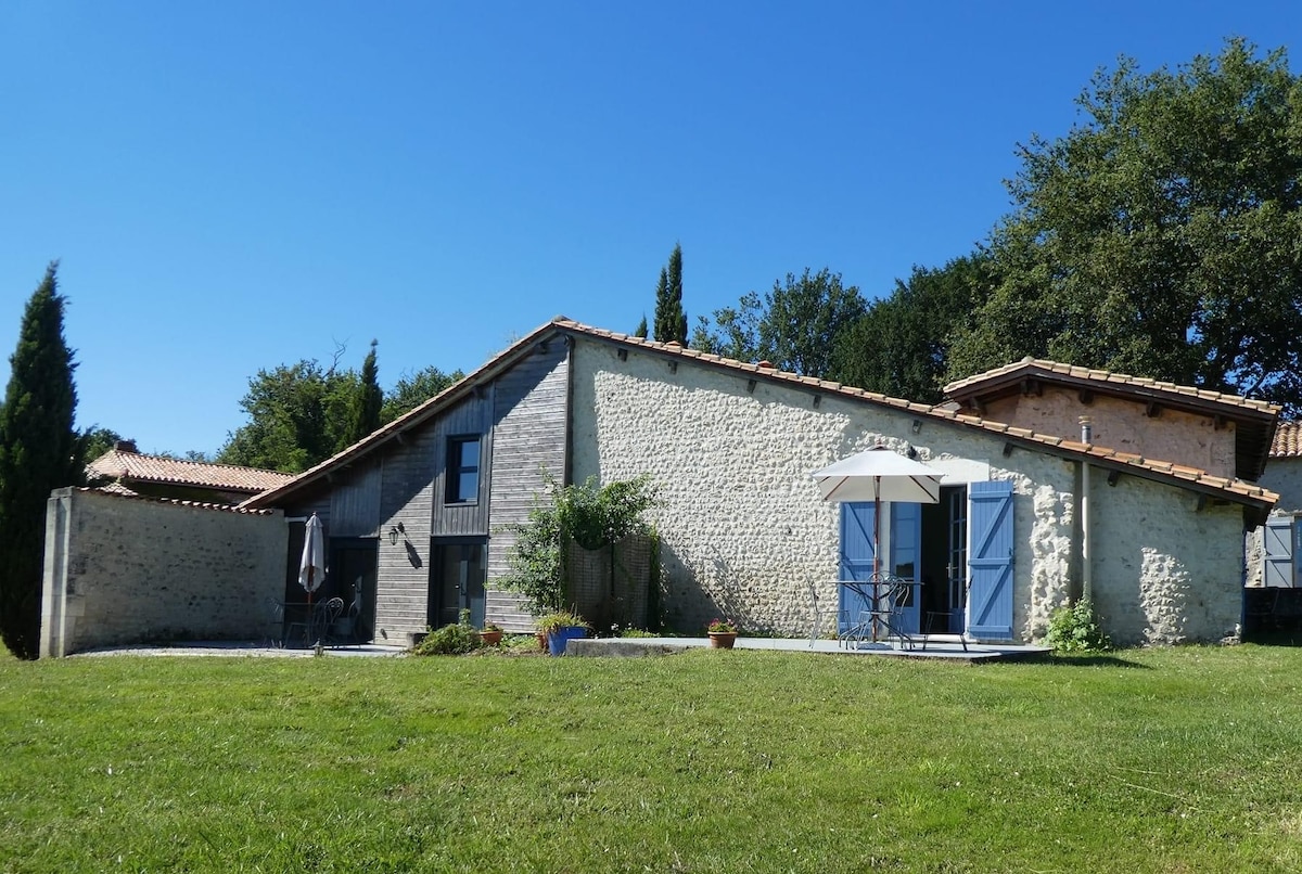 Dans notre maison en campagne, à seulement 12min d'Angoulême, nous vous invitons à séjourner dans l'appartement privatif de 50m2 que nous avions aménagé pour nos enfants, recemment entièrement renové, équipé et décoré avec soin. 2 chambres, 1 séjour/salon/cuisine avec canapé lit et 1 salle d'eau/wc. De juin à septembre, accès libre à la terrasse et à la piscine chauffée ainsi qu'à un espace extérieur repas/détente ombragé privatif. Jusqu'à 6 voyageurs.