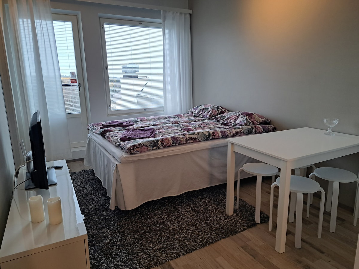 Cozy room with bathroom, kitchenette and French balcony near city center. 140cm wide bed. Bed sheets, towels, and cooking utensils. TV. Microwave, washing machine. In a cellar there’s drying room. Supermarket, bus station, and train station within walking distance. There's a free parking along Karhunkaatajantie. You can also park to the in yard for 3 hours with a parking disc. I will send you instructions for self check in once you have booked. Enjoy Lapland!!