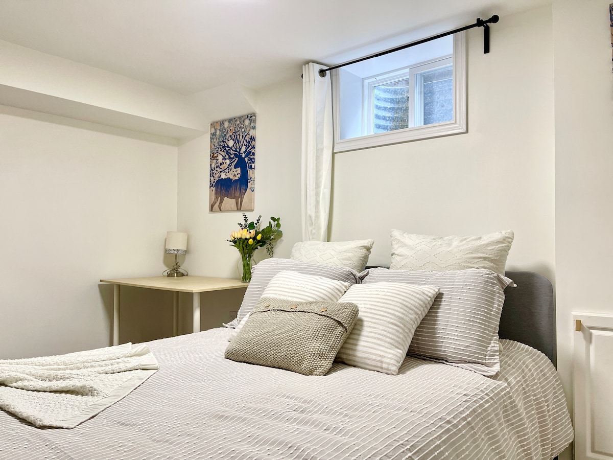 · Estacionamiento sin nieve, 1 cama 1 baño, 1 sala de estar, con lavandería completa y cocina, ¡refrigerador por supuesto! ¡Y son exclusivamente para tu uso! · Ambiente cómodo con cama tamaño queen, ambiente acogedor, así como entrada con teclado para garantizar tu seguridad. · Situado en un vecindario tranquilo. 1 minuto al parque forestal y campo de carrera. · Proporciona 1 estacionamiento. A 3 minutos a pie de las paradas de autobús. A 10 minutos en auto de la autopista 401. · Escapa del ajetreo y relájate en este pequeño apartamento sótano premium de alta privacidad.