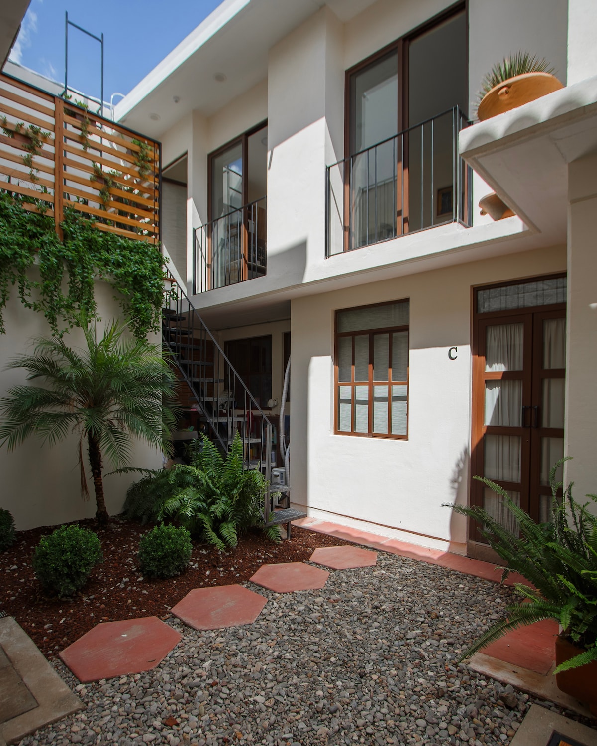 Disfruta del fácil acceso a todo desde este alojamiento perfectamente ubicado y que brinda una estancia tranquila y confortable. El departamento tiene en la planta baja la estancia con sillón, mesa de comedor para dos personas, cocina y baño completo con regadera; escaleras tipo caracol para subir a la planta, donde se encuentra la recamara con cama, closet, aire acondicionado y cortinas blackout, desde ahí se accede a la terraza semi-privada con dos sillas para exterior y sombrilla.